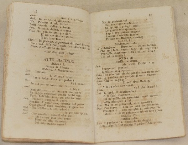 In 16. Dim. 15,5x10,5 cm. Pp. 30. Dim. volantino cm. 24x16,5. Bel libretto d'opera senza data ma del 1850 circa dell'opera in tre atti "Otello" di Gioachino Rossini (1792-1868). La prima rappresentazione ebbe luogo al Teatro del Fondo di Napoli il 4 dicembre 1816. Insieme al libretto un volantino originale coevo che pubblicizza l'Otello diretto da Antonio Siragusa al Teatro Nuovo di Napoli con la lista degli attori e i prezzi dei biglietti. Gli attori:Maurelli, Marra, Scotti, Cartelli, Guidi, Rosillo, Basile, Morghen. In buone condizioni. Bella brossura editoriale illustrata. Brossura editoriale in buone condizioni generali con lievi usure ai margini e dorso (vedere foto). Legatura in buone condizioni. All'interno le pagine si presentano in ottime condizioni con rare fioriture. Beautiful booklet of 1850's circa of the work in three acts "Otello" by Gioachino Rossini (1792-1868).<BR>The first representation took place in the Teatro del Fondo in Naples the 4th of december 1816. Together with the booklet an original coeval advertising poster about Otello directed by Antonio Siragusa in the Teatro Nuovo di Napoli with list of actors and prices of tickets.<BR>In good conditions. Beautiful illustrated editorial cover. Editorial cover in good general conditions slightly worn in the edges and spine (see the photo). Binding in good conditions. Inside pages are in very good conditions with occasional foxings.