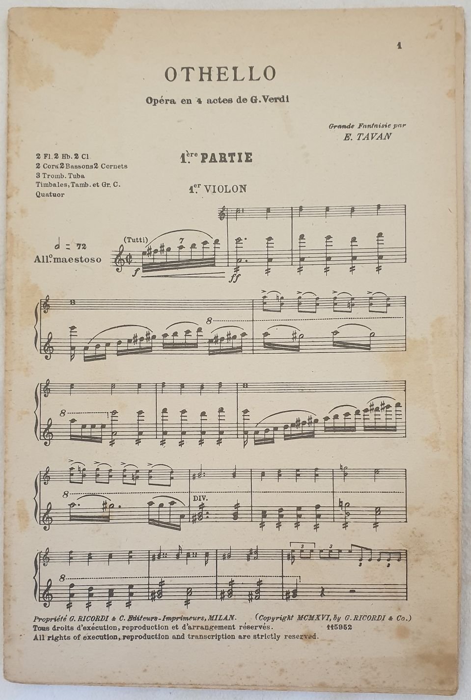 Partitura per orchestra del 1926 della melodia "Othello" di Giuseppe Verdi arrangiata da E. Tavan. Copertina assente. STRUMENTI: primo violino, corni ANNO: 1926 DIMENSIONI: In 4. cm 27x17,5 PAGINE: pp. 26 CONDIZIONI: Buone condizioni. Complete score for orchestra of 1930 of the melody "Othello" Giuseppe Verdi arranged by E. Tavan. Cover lacks. STRUMENTI: violin, horns YEAR: 1926 SIZE: In 4. cm 27x17,5 PAGES: pp. 26 CONDITIONS: Good conditions.