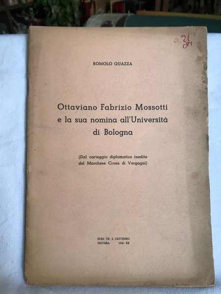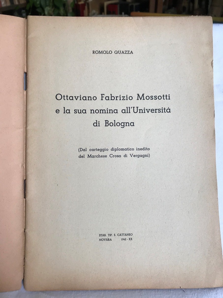 Fascicolo in 8 grande, titolo al piatto, frontespizio (mancanza all'angolo superiore), 35 pp., bianca finale. Interessante spaccato politico e diplomatico riguardante il matematico, fisico e astronomo Novarese Mossotti, derivante dal carteggio inedito del Marchese Crosa di Vergagni, relazionato e commentato dallo storico Biellese. Poco comune, in buono stato, intonso.