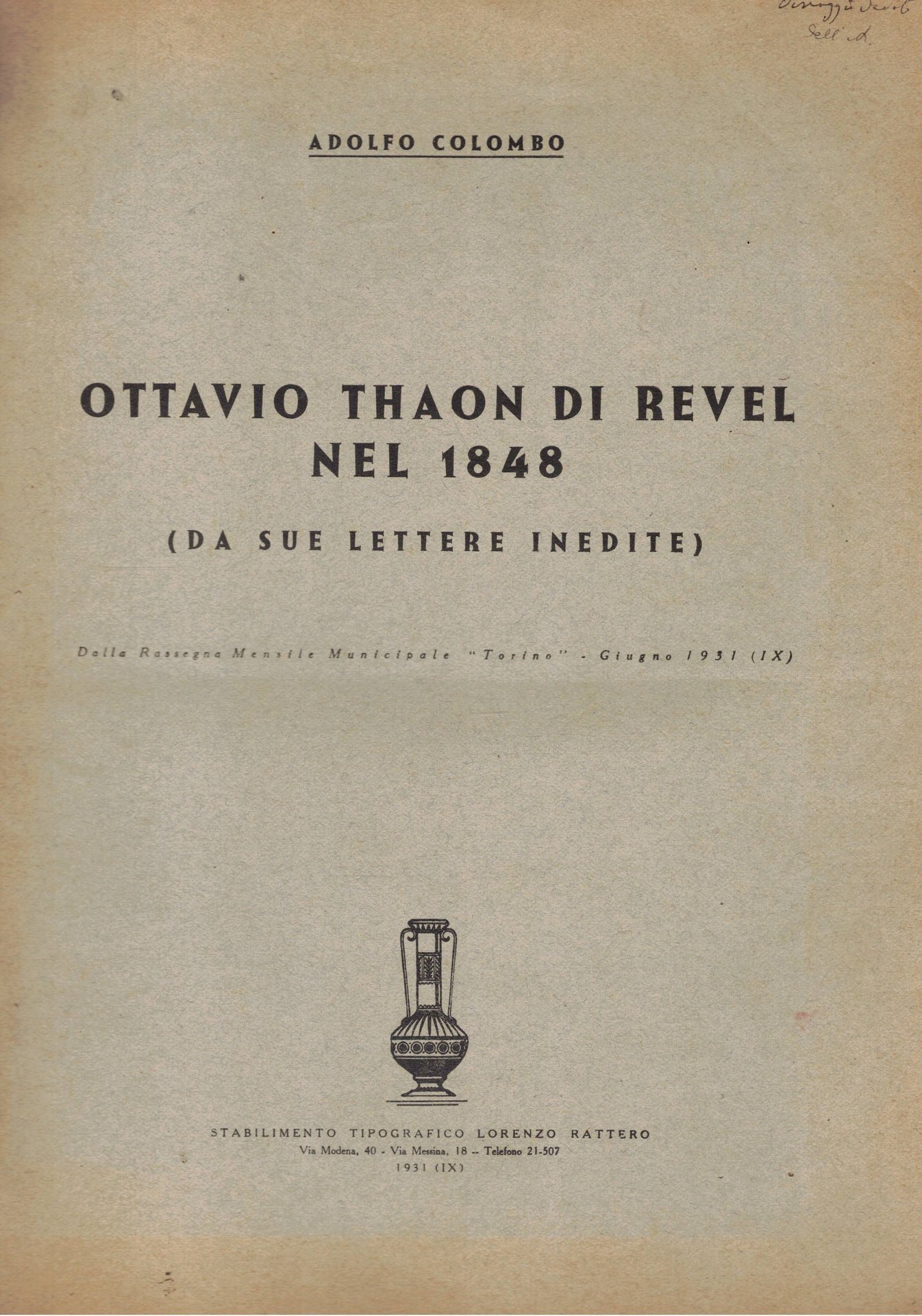 Ottavio Thaon di Revel nel 1848 (sa sue lettere inedite). Estratto da Rassegna municipale di Torino del giugno 1931,