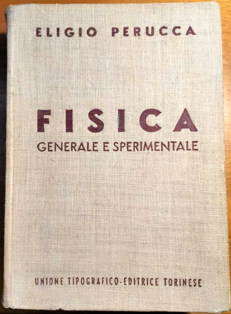 OTTICA ELETTRICITÀ E MAGNETISMO di Eligio Perucca. Volume Secondo della FISICA GENERALE E SPERIMENTALE. Unione Tipografico-Editrice Torinese, terza edizione 1940. XV, 976 pagine, 979 figure in b/n nel testo. Copertina editoriale in tutta tela. Stato di conservazione: buono (pagine normalmente ingiallite, firme di appartenenza, copertina un po’ sciupata, alcune sottolineature a matita rossa)