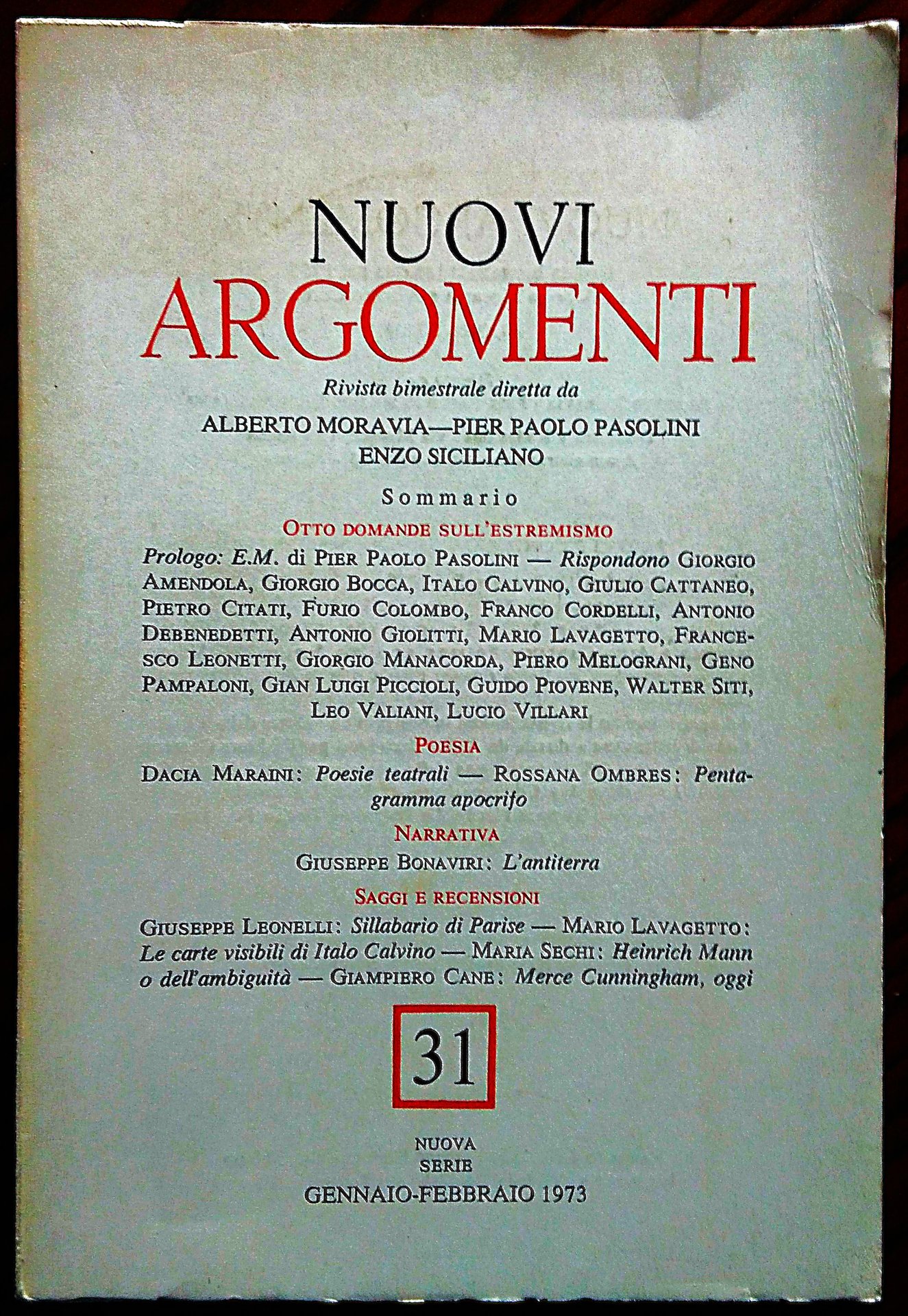 "Otto domande sull'estremismo". In Nuovi Argomenti. Gennaio-febbraio 1973.