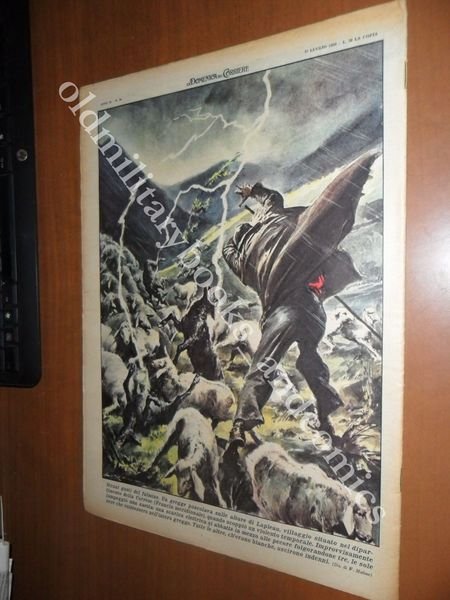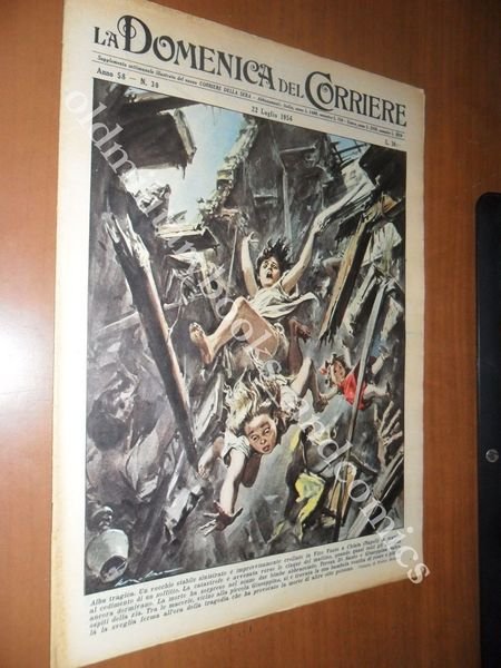 DESCRIZIONE: Domenica del Corriere, Milano, Anno 58 n. 30 (22 Luglio 1956). COPERTINA: "Alba tragica. Un vecchio stabile sinistrato è improvvisamente crollato in Vico Vasto a Chiaia (Napoli) in seguito al cedimento di un soffitto. La catastrofe è avvenuta verso le cinque del mattino, quando quasi tutti gli inquilini ancora dormivano. La morte ha sorpreso nel sonno due bimbe abbracciate, Teresa Di Santo e Giuseppina Salvo, ospiti della zia. Tra le macerie, vicino alla piccola Giuseppina, si è trovata la sua bambola vestita di rosso e più in là la sveglia ferma all'ora della tragedia che ha provocato la morte di altre otto persone." (dis. W. Molino) RETRO: "Strani gusti del fulmine. Un gregge pascolava sulle alture di Lapleau, villaggio situato nel dipartimento della Corrèze (Francia meridionale), quando scoppiò un violento temporale. Improvvisamente lampeggiò una saetta: una scarica elettrica si abbattè in mezzo alle pecore folgorandone tre, le sole nere che esistessero nell'intero gregge. Tutte le altre, ch'erano bianche, uscirono indenni." (dis. W. Molino) CONDIZIONI: Ottime. Con spille, piccole macchie e pieghette. PESO / WEIGHT: 100 gr. without package