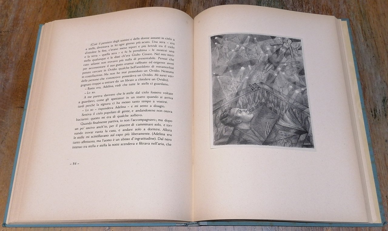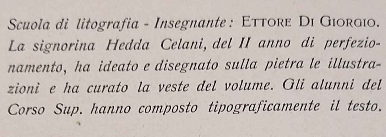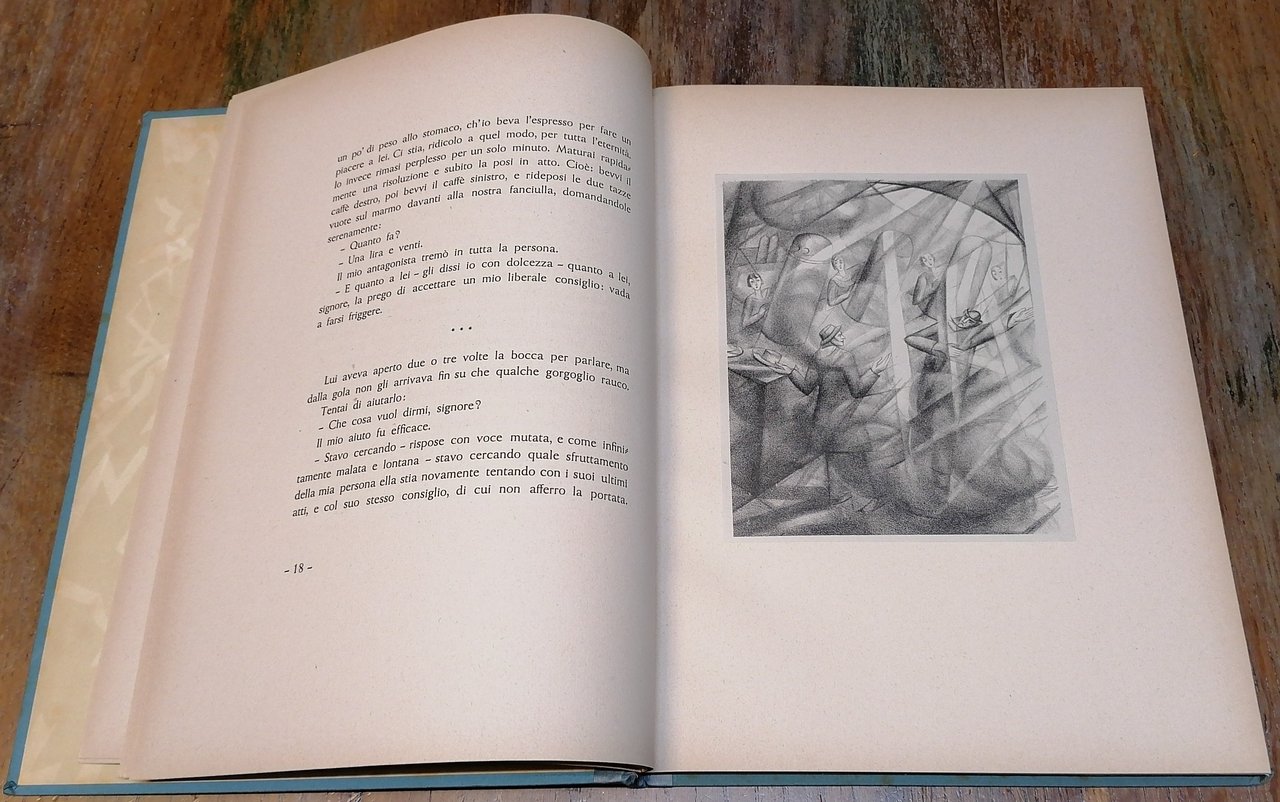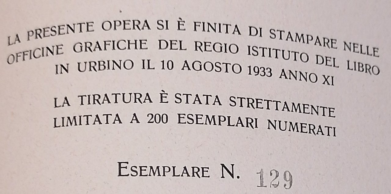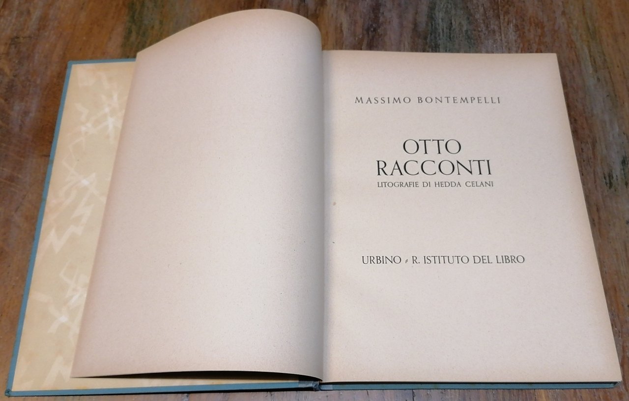 In 4° piccolo, legatura editoriale in cartonato azzurrino, titolo impresso in bianco al piatto anteriore, guardie in carta editoriale decorata, pp. 116,(8), con 8 tavole litografiche in bianco e nero di Hedda Celani applicate a piena pagina. Otto racconti di Massimo Bontempelli tratti dai volumi "La donna dei miei sogni e altre avventure moderne" e "Donna nel sole e altri idilli" pubblicati nel 1925 e nel 1928 da Mondadori : Un'anima in un bar, Quasi d'amore, Le mie statue, Clemenza del mare, La spiaggia miracolosa, L'idillio finito bene, I drammi della malavita, Viaggio sull'arcobaleno. Volume finito di stampare nelle Officine Grafiche del Regio Istituto del Libro in Urbino il 10 agosto 1933, la tiratura è stata strettamente limitata a 200 esemplari numerati (es. n. 129). Dorso ben rifatto con tela azzurrina, peraltro esemplare tutto originale ed in ottimo stato di conservazione.