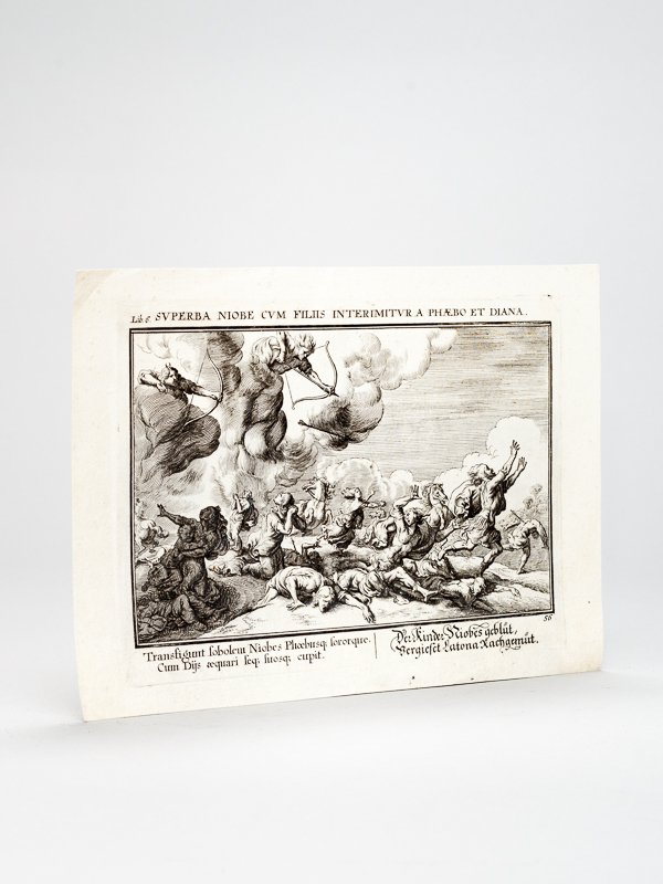 [ Ovidii Metamorphosis, oder Verwandelungs Bucher 1703 ] Book 6 Plate 56 : Superba Niobe cum Filiis interimitur a Phaebo et Diana