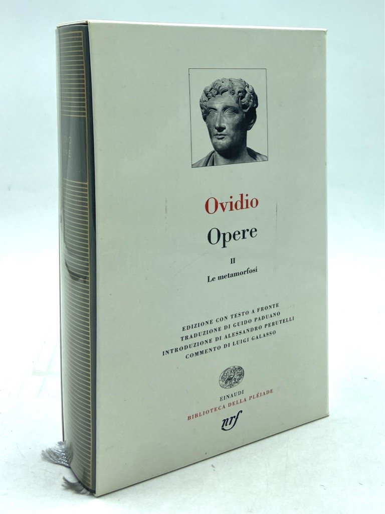 Legatura editoriale in pelle con acetato e cofanetto, cm 18 x11.5, pp CXX 1646 (10). Collezione Biblioteca della Pleiade. Secondo volume delle Opere di Ovidio nella Pléiade einaudiana, dedicato alle Metamorfosi, con testo latino a fronte della traduzione di Guido Paduano, introduzione di Alessandro Perutelli (Il fascino ambiguo del miracolo laico), commento e bibliografia di Luigi Galasso.