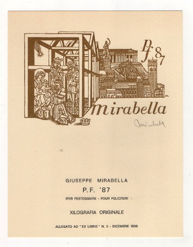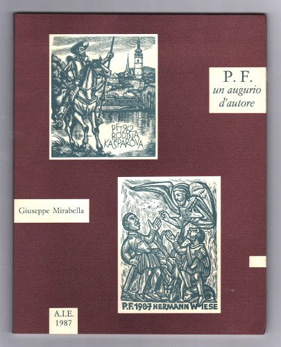 In 4to ( cm 28x22) brossura editoriale pag. 56. Tiratura di 500 copie. P.F. come Per Festività. Catalogo di carte augurali. 138 illustrazioni di incisioni di artisti internazionali. Allegate due stampe (cm 22X16) originali autografate di G. Mirabella.