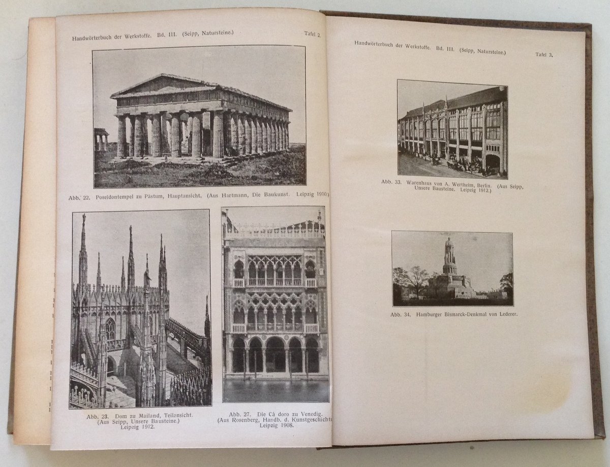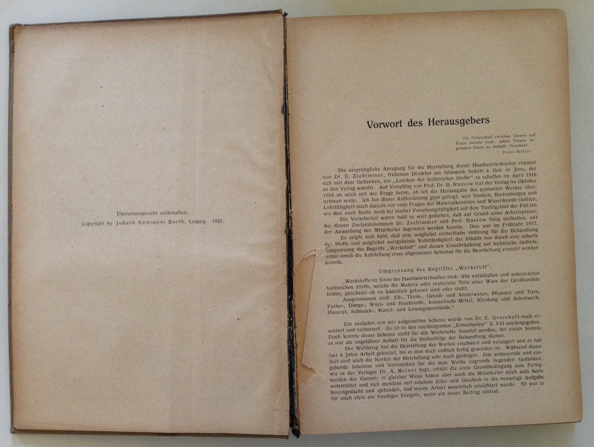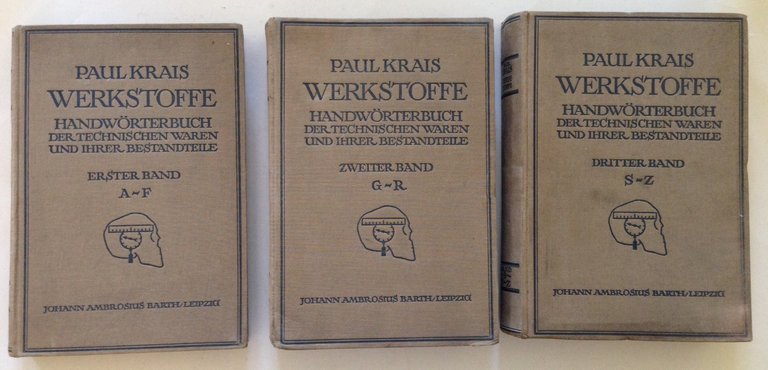P. Krais, Werkstoffe Handworterbuch der Technischen Waren und Ihrer Bestandteile Johann Ambrosius Barth, Leipzig, 1921; cm. 25x17,5; pp. 529, 784, 728; 3 volumi; vol. 1 con 25 tavv. f.t., vol. 2 con 1 tav. f.t., vol. 3 con 5 tavv. f.t.); cartonato ed. rilegato t. tela con titoli al piatto anteriore e al dorso; testo in lingua tedesca. Condizioni di conservazione Esemplari in buone condizioni con leggere tracce d'uso e del tempo; dorso del volume 1 con uno strappo, con cerniera anteriore interna fessurata e con uno strappetto alla prima pagina (vedi foto); interni con leggere bruniture. SETT170.L15347 MT