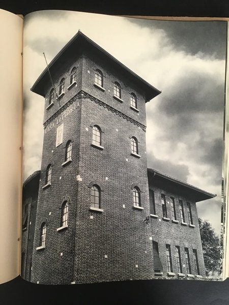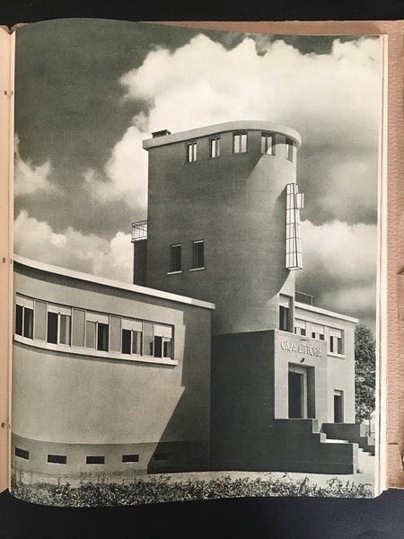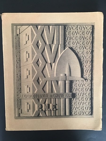 Importante volume In folio schedato da Giorgio Grillo ne "Il libro fotografico Italiano 1931-1941. Sperimentazione Industria Propaganda", che citiamo qui sotto nella descrizione, stampato in 1 esemplare per il Duce e 600 esemplari numerati (il nostro e' il n.45). In-folio, con pp. di testo impresse unicamente al recto, cartonatura editoriale con legacci e con titolo e figura di un'aquila in oro al piatto, protetta da sovraccoperta cartonata figurata con motivi richiamanti i moduli formali dell'architettura fascista, figure di vanghe e picconi e fasci littori.