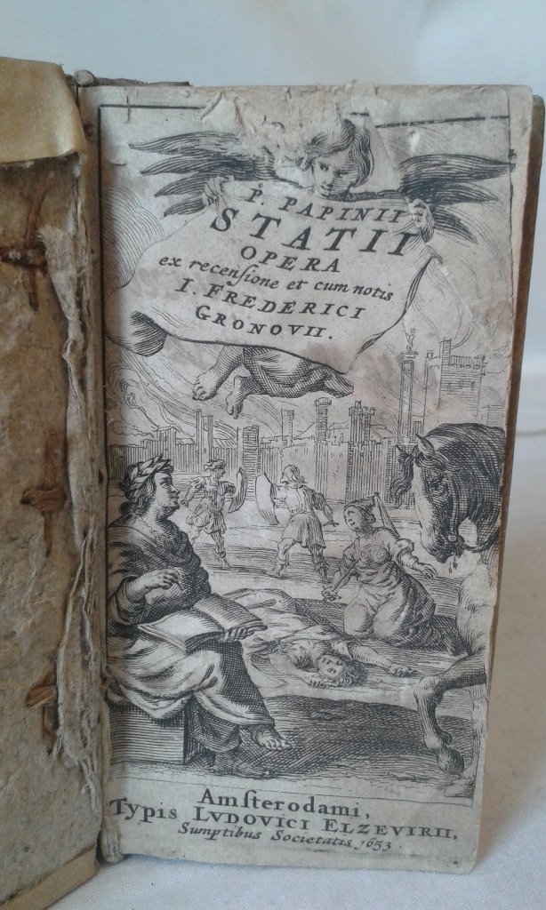 Volume in 16 legato in pergamena, frontespizio inciso in rame molto animato (piccolissima mancanza al bordo superiore, rifilato il bordo destro), 3 cc., 422 pp., carta d'errata, sguardia finale. Bell'elzeviriana in malo modo rifilata, molto letta, impietoso restauro antico alla pagina 165 e massimamente alla 172. oltre alle 'Silvarum' ed alla 'Thebaidos', vi si trova l'Achilleidos' ed i 'Fragmenta'. Criminalmente rifilata, ma completamente leggibile, copia in ancor discrete condizioni, sicuramente poco comune.