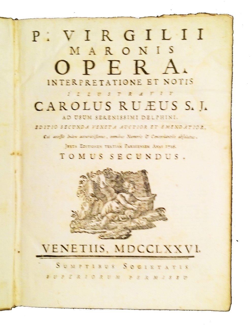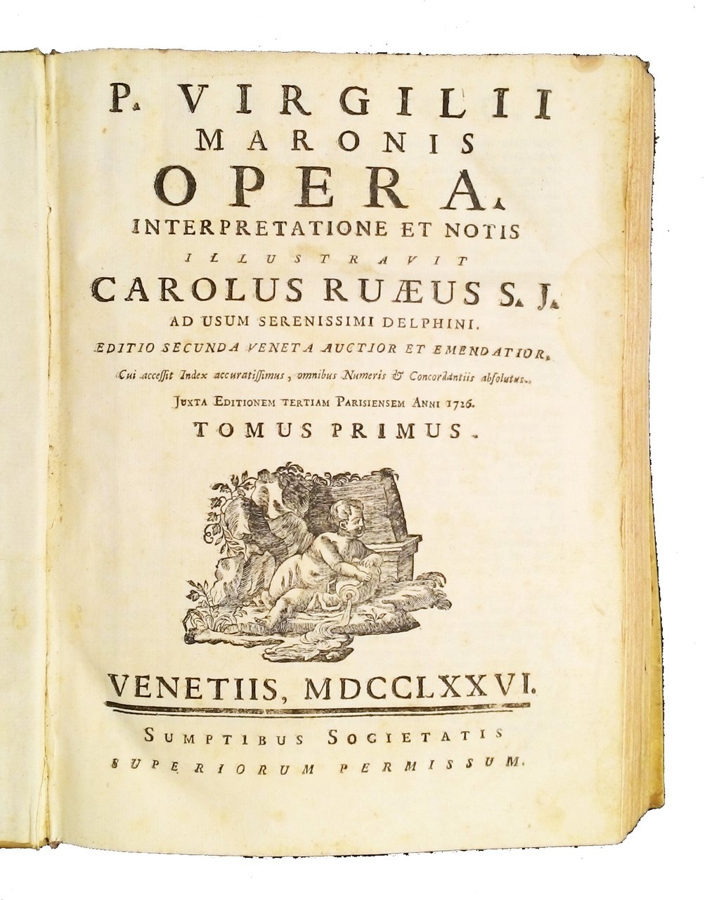 P. Virgilii Maronis Opera. Interpretatione et notis illustravit Carolus Ruaeus S.J. Ad usum serenissimi delphini. Editio secunda veneta auctior et emendatior, cui accessit index accuratissimus, omnibus numeris et concordantiis absolutus. Iuxta editionem tertiam parisiensem anni 1726. Tomus primus (-secundus).