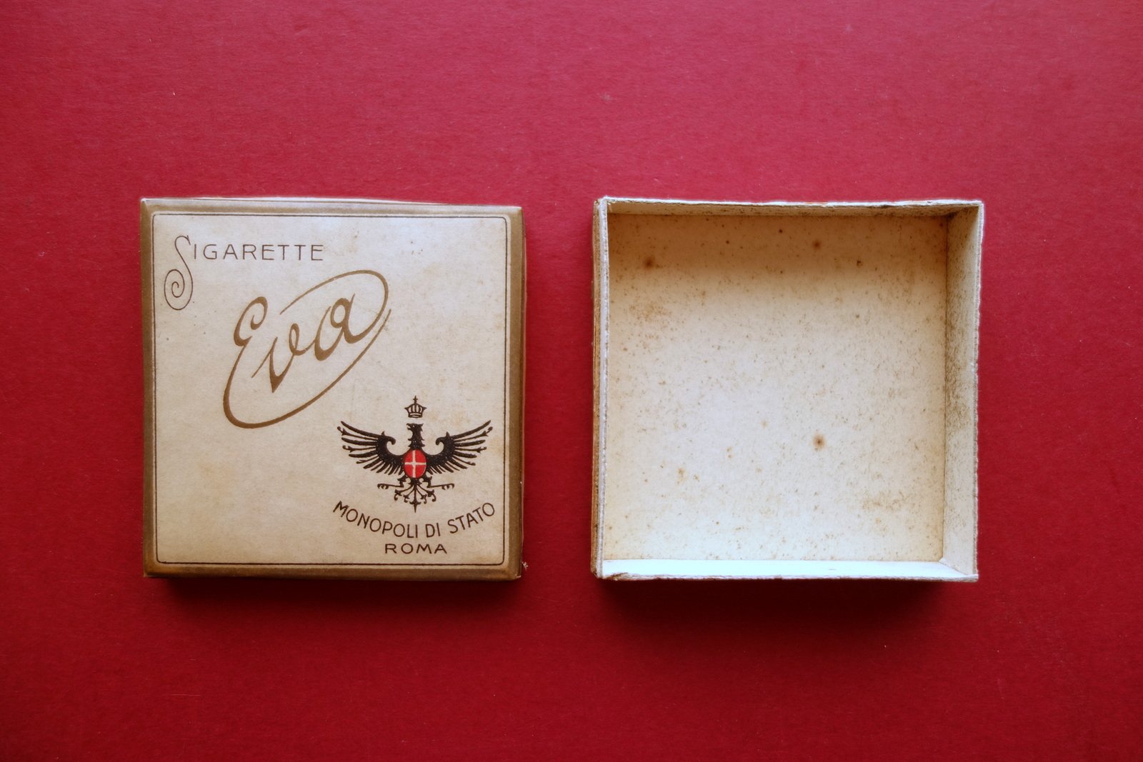 Pacchetto di sigarette, Sigarette Eva" 20 sigarette S. d. (anni '20 - '30 del Novecento); pacchetto di sigarette originale in cartoncino, con bella grafica d'epoca e aquila sabauda. Cm 7x7,5. Condizioni di conservazione Esemplare in buono stato con tracce di utilizzo, minime bruniture e tracce di sporco, qualche minima abrasione ai margini e al retro (per maggiori dettagli vedi foto). Originale. SC04.D0351 N "