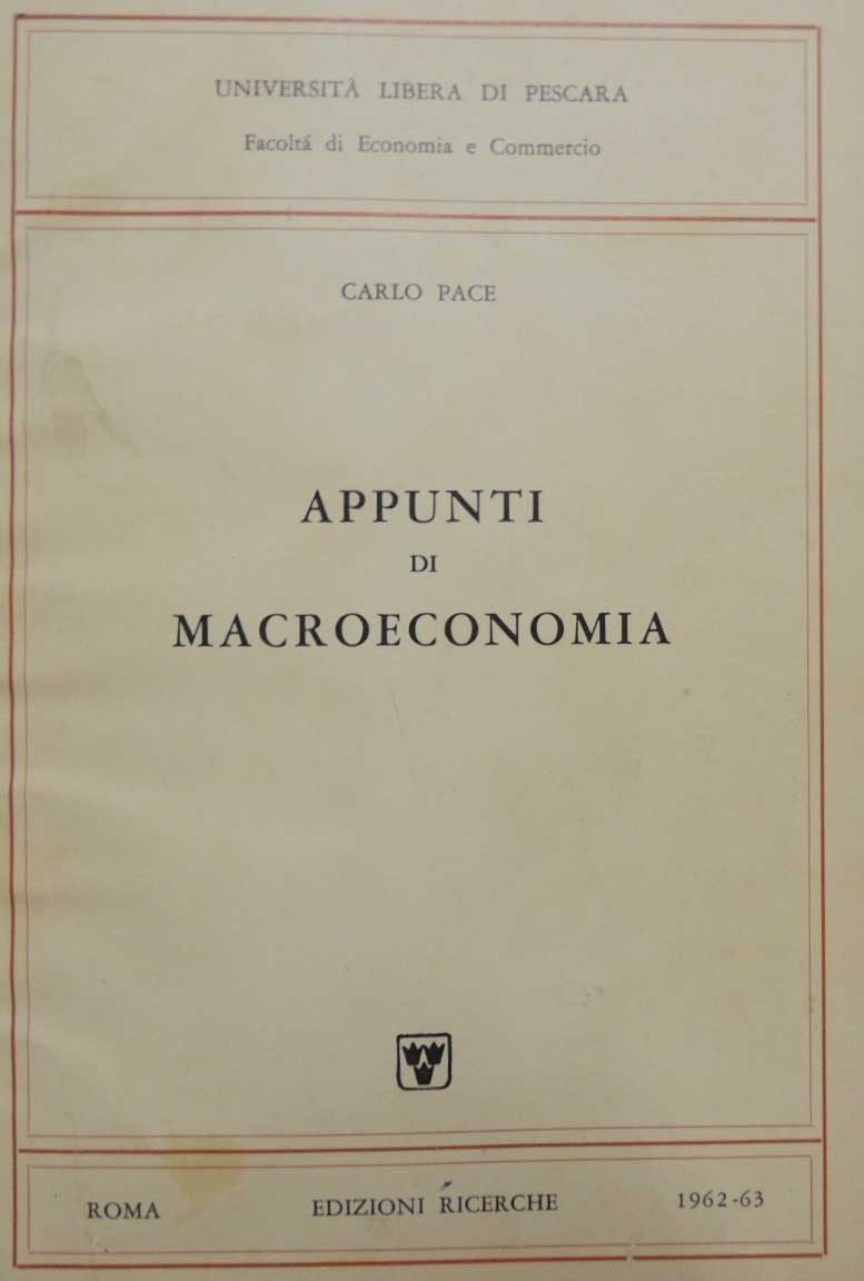 Carlo Pace, Appunti di macroeconomia, Edizioni Ricerche, Roma 1962, pp. 114, 1 c. di tav. f.t. ripiegata ill. b.n., cm 24, br. ed. In testa al frontespizio: Università Libera di Pescara – Facoltà di Economia e Commercio. Caratteri dattiloscritti. Leggere tracce d’uso, lieve traccia di gora di modesta estensione alla brossura che non intacca per nulla l’interno del volume, qualche carta con lievi sottolineature a biro, una piccola annotazione a biro al frontespizio, ma nel complesso copia comunque in buono stato e perfettamente fruibile.