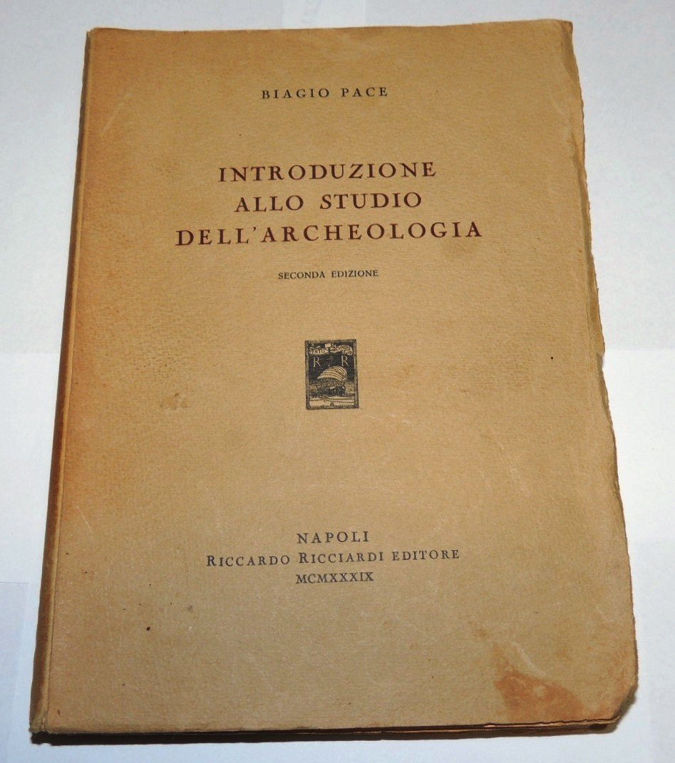 Biagio Pace, Introduzione allo studio dell'archeologia, seconda ed., Riccardo Ricciardi editore, Napoli 1939, pp. 245, cm 22, br. ed. Qualche sottolineatura a matita, scritte sull'ultima pagina, tracce d'uso alla copertina. Interessanti capitoli dedicati all'archeologia, all'architettura, alla scultura, alla pittura, alle monete, ecc.