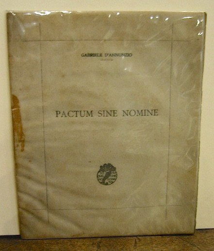 4to (cm. 25,5), 2 cc.nn., 14 cc. (le prime 4 contengono a stampa in rosso il ‘Commiato al patto marinaro’ datato 11 Febbraio 1924, le successive in facsimile d’autografo stampato in nero, il testo del Patto marino), 2 cc.nn. Copertina editoriale in carta pergamenata con titolo in nero entro riquadro e l’impresa ‘Io ho quel che ho donato’. Sulla cop. posteriore l’impresa ‘Squadra di San Marco. Ti con nu, nu con ti’. Piccola macchia al margine interno dei piatti, altrimenti ottimo esemplare. Esemplare n. 5 dei 70 numerati a mano stampati su carta celestina a mano, con filigrana ‘G. Miliani Pioraco’, della cartiera G. Miliani e F. Pioraco di Fabriano (esistono esemplari contraffatti perché mancanti della filigrana). Errore a c. 3 ove è riportato ‘Ganghi’ anziché ‘Gandhi’. Molto raro. De Medici, 117; Guabello, 288; Vecchioni, 73b.