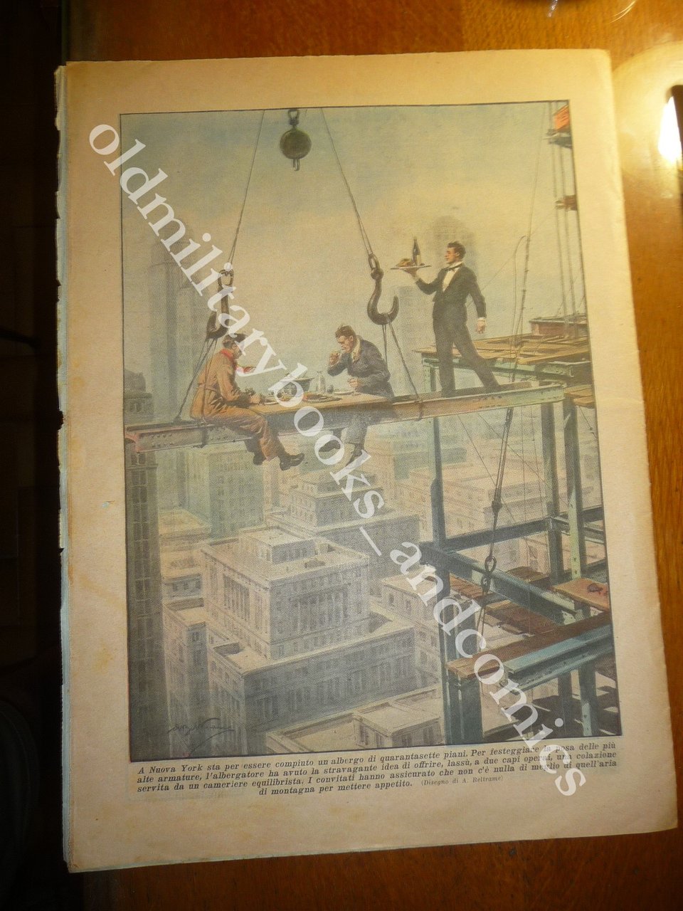 RETRO: A New York sta per essere compiuto un albergo di 47 piani. Per festeggiare la posa delle più alte armature l'albergatore ha avuto la stravagante idea di offrire, lassù, a due capi operai, una colazione servita da un cameriere equilibrista. I convitati hanno assicurato che non c'è nulla di meglio di quell'aria di montagna per mettere appetito.