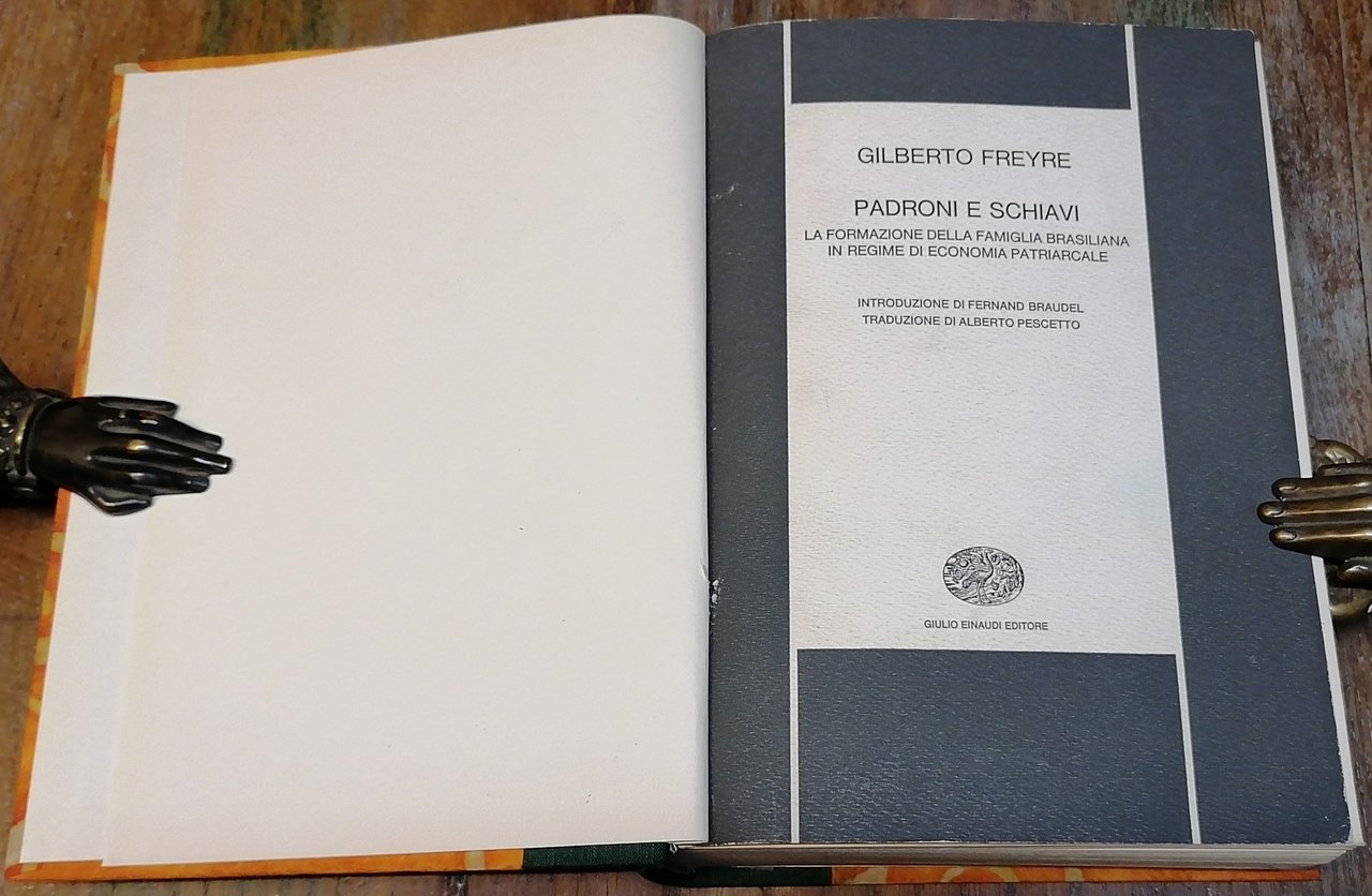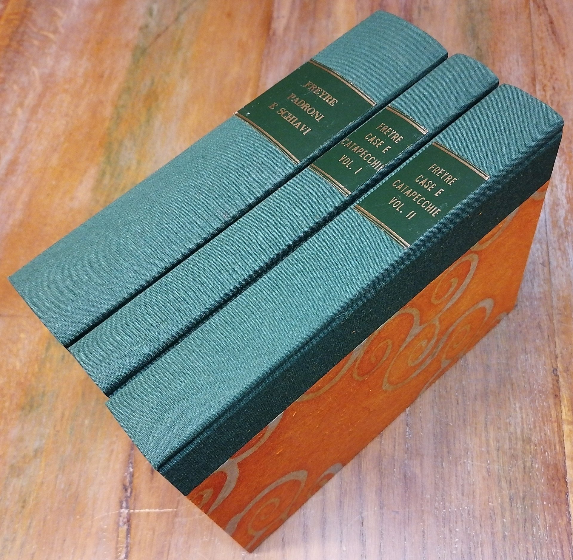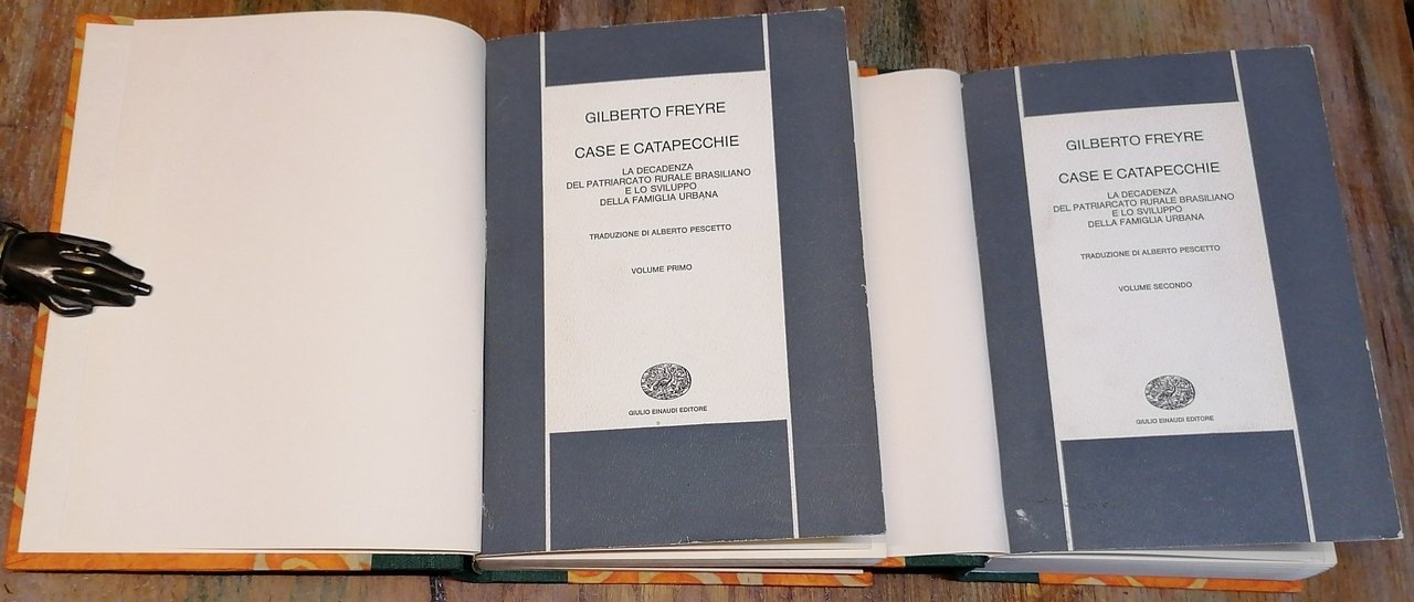 (Brasile; Scienze sociologiche; Civiltà coloniale brasiliana; Lusotropicalismo) Tre volumi in 8°, legatura in mezza tela verde, tasselli in pelle con titoli dorati ai dorsi, piatti rivestiti di carta decorata, conservate tutte le copertine delle brossure editoriali. "Padroni e schiavi" : 1965, pp. XV,(1),544,(4), titolo originale : "Casa-Grande & Senzala. Formaçao da Famìlia Brasileira sob o Regime de Economia Patriarcal", introduzione di Fernand Braudel. "Case e catapecchie" : 1972, due volumi di pp. complessive XIII,(1),768,(6), con 22 illustrazioni nel testo, titolo originale : "Sobrados e Mucambos. Decadencia do patriarcado rural e desenvolvimento do urbano". Collana "Nuova Biblioteca Scientifica Einaudi", traduzioni di Alberto Pescetto. Una firma di proprietà al frontespizio ed alla pagina di Indice della prima opera. Ottimo stato di conservazione per tutti i tomi.