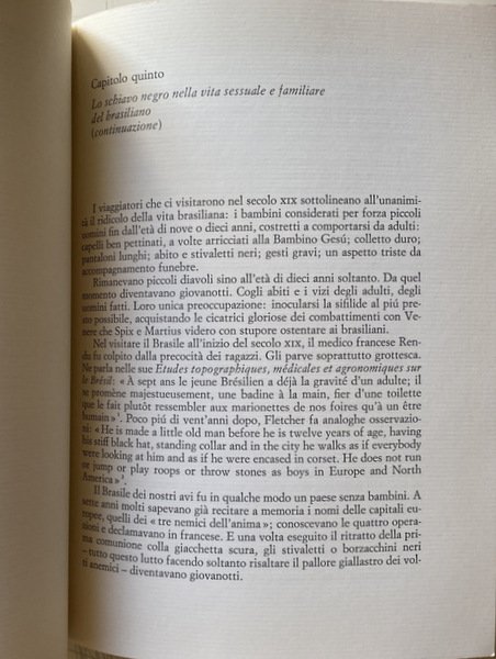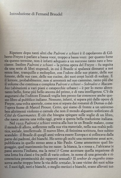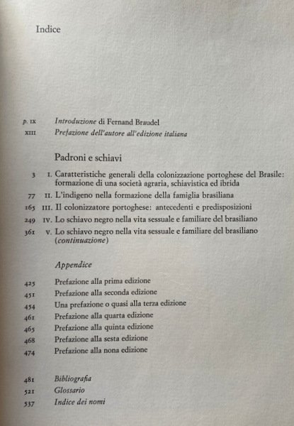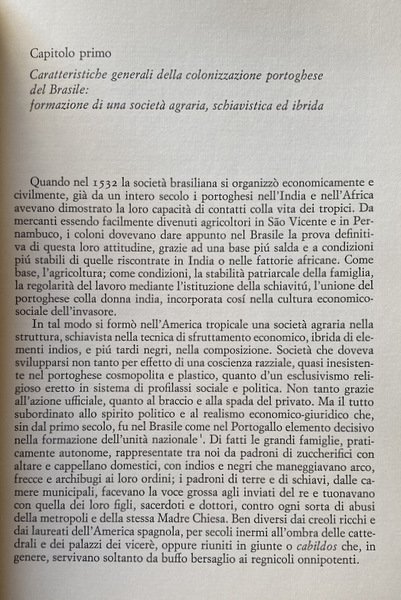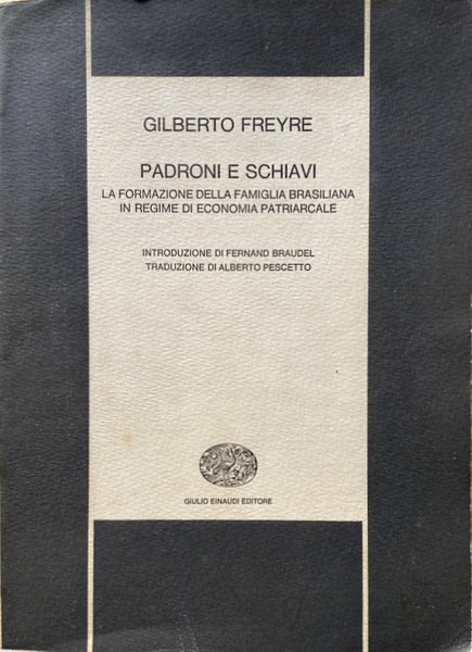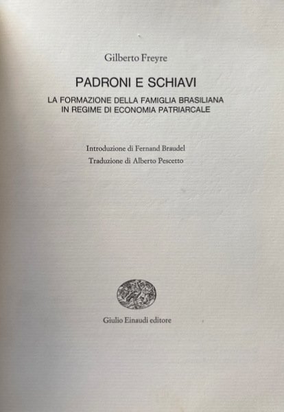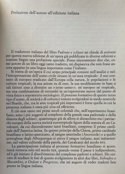 Soggetti: Politica, Società, Colonizzazione portoghese, Antropologia culturale, Studi culturali, Secolo 16-19, Relazioni sociali, Brasile, Condizioni economiche, Scienze sociali, Sociologia rurale, Famiglia, Brasiliani, America del Sud, Portogallo, Colonie portoghesi, Aspetti antropologici, Storia moderna, Case e catapecchie, Decadenza, Patriarcato rurale brasiliano, Razzismo, Indigeni, The Masters and the Slaves, Schiavitù, Schiavi afroamericani, Schiavismo, Padroni, Proprietà, Nordeste, Integração portuguesa nos Trópicos, Economia patriarcale, Uomini, Donne, Lavoro, O escravo negro na vida sexual e de familia, Neri, Negri, Vita sessuale, Sessualità, Riproduzione, Gauchos, Razze, Integrazione, Mescolanze, Incrocio, Mitologia, Miti, Africani, Elide Rugai Bastos, Civilizzazione brasiliana, Civiltà, Brazilian Civilization, Genitori, Religione, Clima, Posizione geografica, Lingua, Tropici, Agricoltura, Contadini, Terra, Piantagioni, Gesuiti, Cristianizzazione, Cristianesimo, Influenze culturali, Abitazioni, Case, Sobrados, Mucambos, Bianchi, Anni Trenta, Novecento, Saggistica, Senzalas, Dimore coloniali, Nuovo Mondo, Fustel de Coulanges, Folklore, Engenhos, Capanne, Canna da zucchero, Fazendas, Aziende, Migrazioni, Cappelle funerarie, Morti, Sepoltura, Convivenza, Bambini, Alimentazione, Abitudini, Canti primitivi, Danze, Danza, Musica, Città, Periferia, Urbanesimo, Casa padronale, Etnologia, Europa, Europei, Natura tropicale, Viaggiatori, Malattie, Costumi, Documenti, David Riesman, Critica, Soares de Sousa, Vespucci, Léry, Lopes Gama Sacramento, von Martius, Viana Oliveira, Nobrega, Pitt-Rivers, Pietro II, Reali, Re, Carvalho e Mello Pombal, Burton, Byron, Cardim, Dampier, Dionigi, Cavalcanti, Coelho, Ferdinando il Cattolico, Fernando I, Graham, Montezuma, Karsten, Azevedo, Anchieta, Cardinale Alessandrino, Michele Bonelli, Famiglie, Libri Vintage Fuori catalogo, Bibliografia, Riferimento, Consultazione, Letteratura, Ocas, Fattorie, Animali, Giocattoli, Vestiario, Gusto, Figli illegittimi, Amanti, Concubine, Matrimonio, Riti, Rituali, Minas Gerais, Unioni, Concubinato, Sexual and Family Life, Glossary of the Brazilian Terms, Studi etnici, Negros, 1888, Abolizione, Ottocento, Paradiso razziale, Estudos Afro-Asiáticos, Fazendeiros, Senhores de ebgenhos, Miscegenazione, Miscigenação, Mulatti, Indigeni, Convivenza pacifica, Teorie sociologiche, Lusitani, Lusotropicalismo, Democrazia razziale, Matrimoni interrazziali, Pregiudizi razziali, Fusione, Assimilazione, Tolleranza, Aventura e Rotina, Antonio de Oliveira Salazar, Imperialismo culturale, Società multietnica, Politics, Society, Portuguese colonization, Cultural anthropology, Cultural studies, 16-19th century, Social relations, Brazil, Economic conditions, Social sciences, Rural sociology, Family, Brazilians, Portugal, Portuguese colonies, Anthropological aspects, Modern history, Houses and shacks, Decadence, Brazilian rural patriarchate, Racism, Mestizo, Indigenous, Slavery, African American slaves, Property, Patriarchal economy, Men, Women, Work, Blacks, Negroes, Sex life, Sexuality, Reproduction, Races, Integration, Mixings, Crossroads, Mythology, Myths, Africans, Brazilian civilization, Civilization, Parents, Religion, Climate, Geographic location, Language, Tropics, Agriculture, Peasants, Land, Plantations, Jesuits, Christianization, Christianity, Cultural influences, Dwellings, Houses, Whites, Years Thirties, Twentieth century, Nonfiction, Senzalas, Colonial mansions, New world, Huts, Sugar cane, Companies, Migrations, Funeral chapels, Dead, Burial, Coexistence, Children, Nutrition, Habits, Primitive songs, Dances, Music, City, Suburbs, Urbanism, Manor house, Ethnology, Europe, Europeans, Tropical nature, Travelers, Diseases, Customs, Documents, The Catholic, Families, Out of print books, Bibliography, Reference, Consultation, Literature, Farms, Animals, Toys, Clothing, Taste, Illegitimate children, Lovers, Concubines, Marriage, Rites, Rituals, Unions, Concubinage, Ethnic studies, Negros, Abolition, Nineteenth century, Racial paradise, Miscegenation, Mulattos, Indigenous people, Peaceful coexistence, Sociological theories, Lusitanians, Lusotropicalism, Racial democracy, Interracial marriages, Racial prejudices, Fusion, Assimilation, Tolerance, Cultural imperialism, Multi-ethnic society