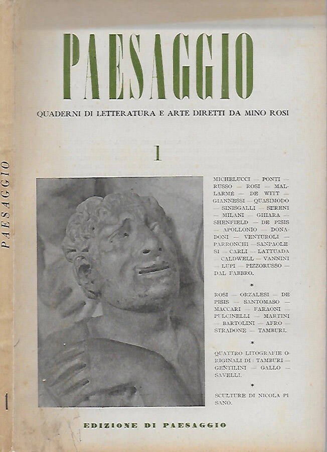 Brossura commerciale, Quaderni bimestrali di Letteratura e Arte - Anno I, Numero 1 - Aprile-Maggio 1946; copertina in cartoncino naturale illustrata, segnata da dissolvenze seppia, brunitura del tempo e fioriture, molto buono l'interno con aloni di umidità che non interferiscono con la fruibilità del testo, arricchito da numerose riproduzioni in nero di opere d'arte, fogli intonsi. N. pag. 70.