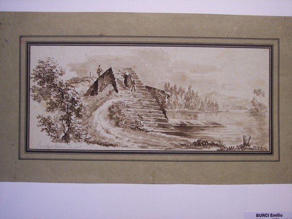 Lavis color seppia su carta.<BR>Cm. 12 x 27,5.<BR>Il foglio è a sua volta applicato su carta.<BR>Firnato a matita ("Emilio Burci fece").<BR>CONDIZIONI OTTIME.