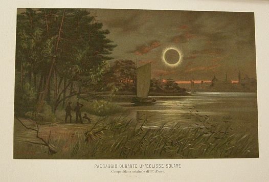 Paesaggio durante un'eclissi solare. Tratto da "L'universo stellato. Trattato di astronomia popolare" del dott. M. Guglielmo Meyer.