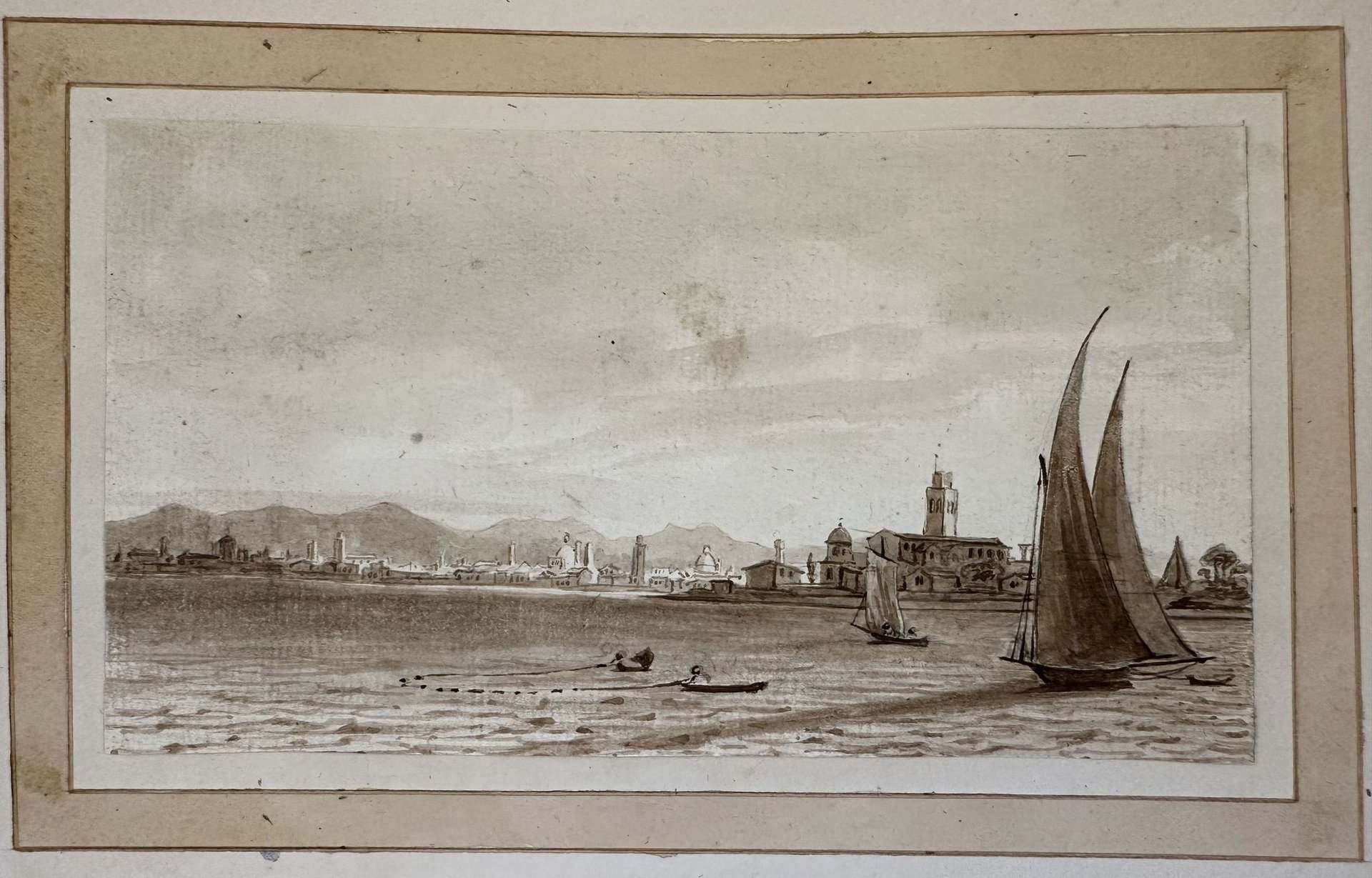 Veduta animata di un paesaggio marino seppia montata su un cartoncino Autore: Anonimo Data: metà del XIX secolo Tecnica: pittura seppia su carta Dimensione del cartoncino: 31,5x22 cm Dimensione foglio: 19,5x11,5 cm Condizioni: Buone. Alcune fioriture. MancanzeLyhtographic view of a sepia sea view mounted on a carton base Author: Anonimous author Date: 1850 circa Technique: Sepia painting on paper Leaf Dimension: 31,5x22 cm Engraving Dimension: 19,5x11,5 cmConditions: Good conditions. Some foxing. Lackings