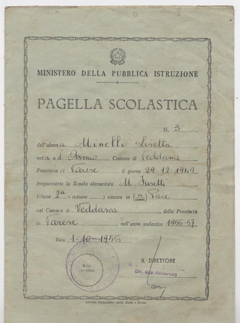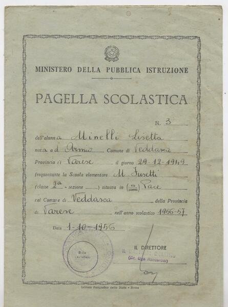 Pagella scolastica scuola elementare M. Fusetti comune di Veddasca (VA)