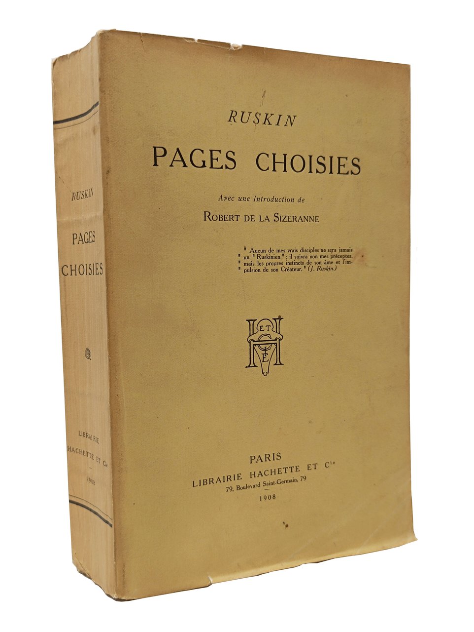 Avec une introduction de Robert de la Sizeranne. Lingua del testo: Francese. Formato: 12,5 x 19 cm circa. Pagine: XXXVI + 266. Con ritratto fotografico in nero di John Ruskin in anteporta. Piccole belle incisioni decorative, poste come cornicette, all'inizio di ogni sezione. Stato di conservazione: piccola mancanza sul margine (bianco) inferiore del foglio che contiene le due pagine 21-22 ma, nel complesso, un esemplare decisamente ben conservato. Interno molto fresco. Rilegatura compatta. Privo di annotazioni o altri segni nel testo. In brossura. Pima edizione.