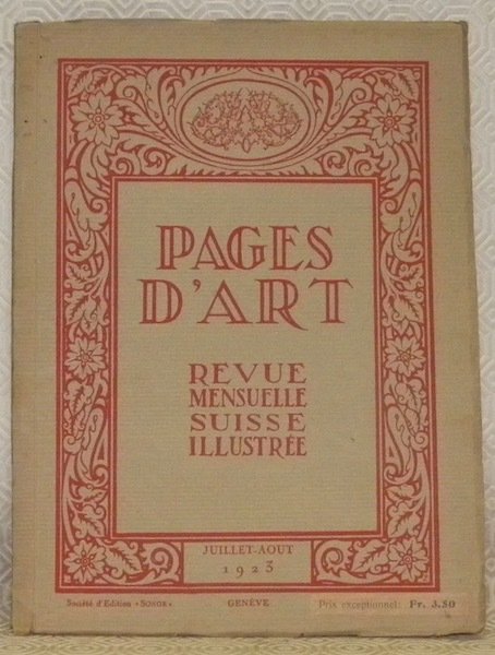 Pages d’Art. Juillet-Août 1923. Revue Mensuelle Suisse Illustrée. Sommaire du numéro de Juillet-Août 1923: Louis Rivier et les peintres de l’Aula de l’Université de Lausanne (16 illustrations), Georges Bonnard. - Art et Publicité (4 illustr.), John Pisteur. - Les Marbres de Houdon au Musée de Genève (2 illustr.) - La Musique; “Parsifal”, par Jean Bartholoni. - Souvenirs de ma vie artistique, Alphonse Dami. - Pages pour tous; A nos lecteurs, Chronique féminine (4 illustrations), Le bjiou (suite), 3 illustrations, dont une en couleurs. - Carnet du Mois.