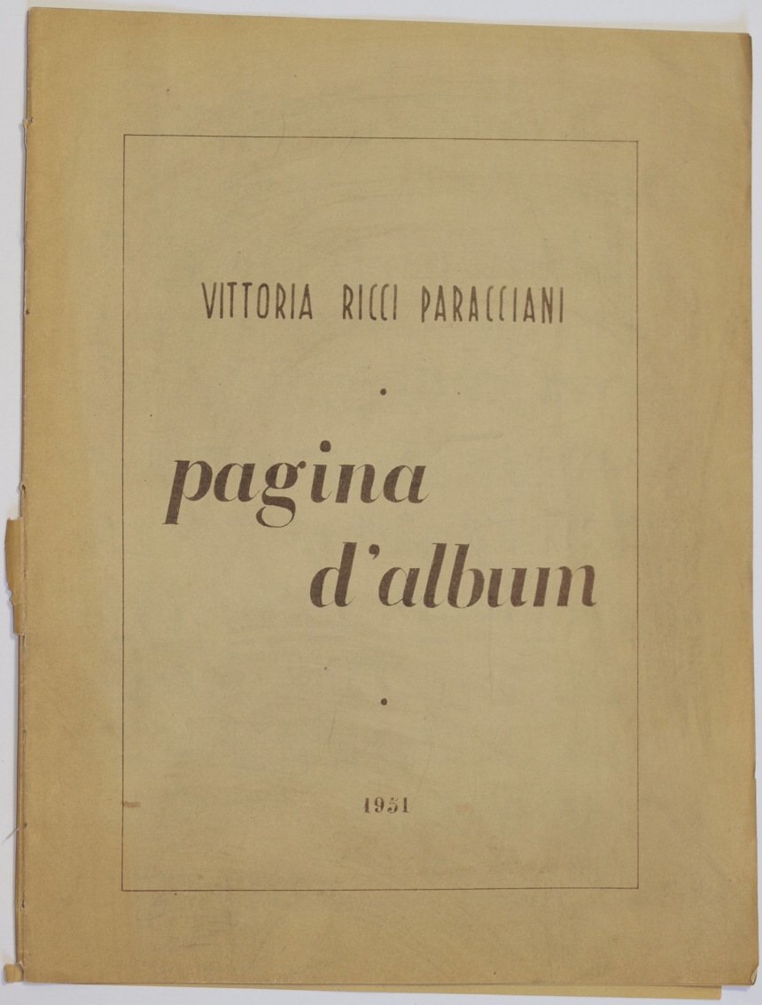 In 4. Dim. 32x24,5 cm. Pp. 11. Edizione del 1951 di questo spartito per pianoforte della melodia "Pagina d'album" di Vittoria Ricci Paracciani. In buone condizioni. Copertina editoriale in buone condizioni generali con lievi usure e parti mancanti ai margini e dorso. Legatura in buone condizioni. All'interno le pagine si presentano in buone condizioni con rare fioriture. Mende. Edition of 1951 of this musical score for piano of the melody "Pagina d'album" by Vittoria Ricci Paracciani. In good conditions. Editorial cover in good general conditions with wearings and missing parts in the edges and spine. Binding is in good conditions. Inside pages are in good conditions with occasional foxings. Usage signs.