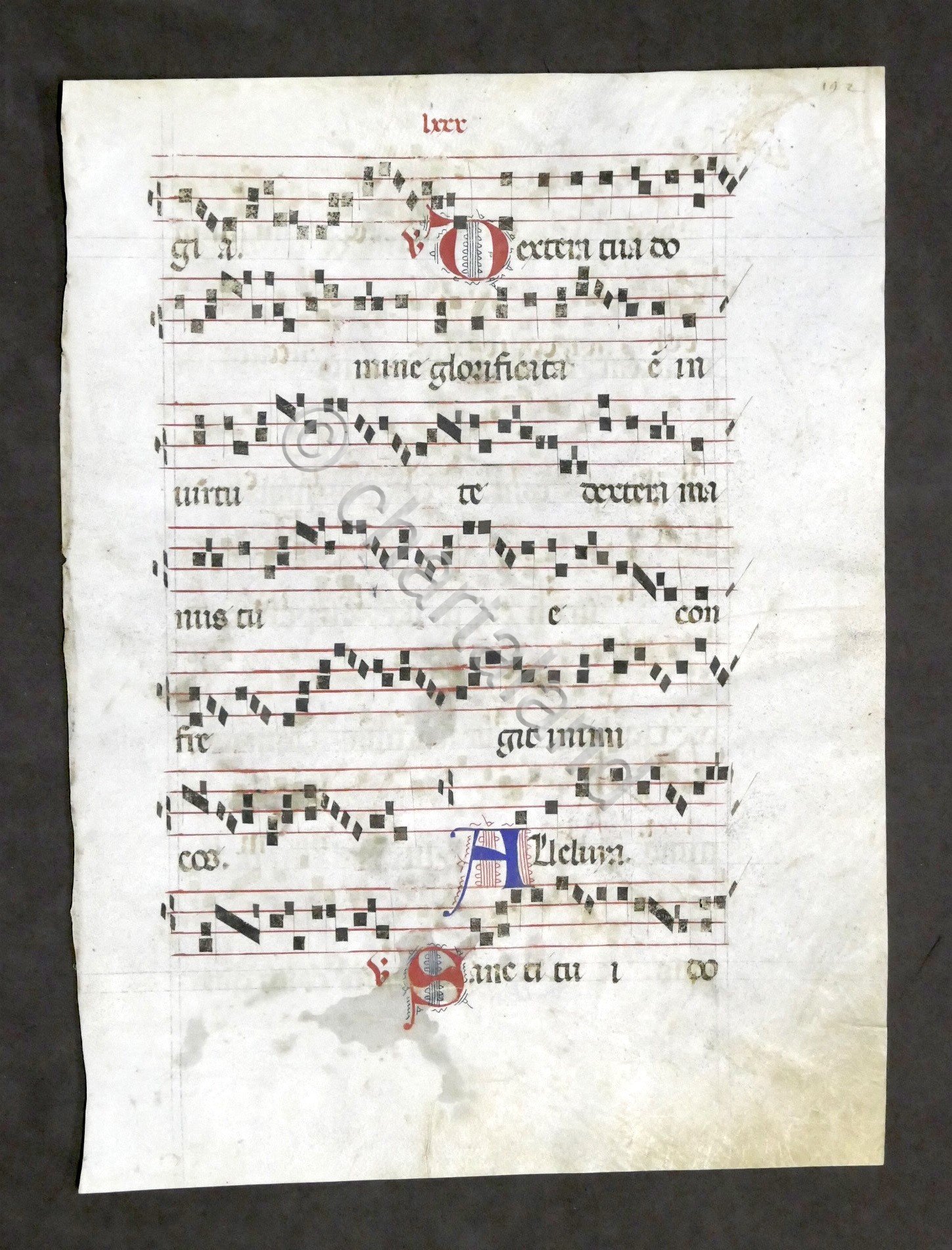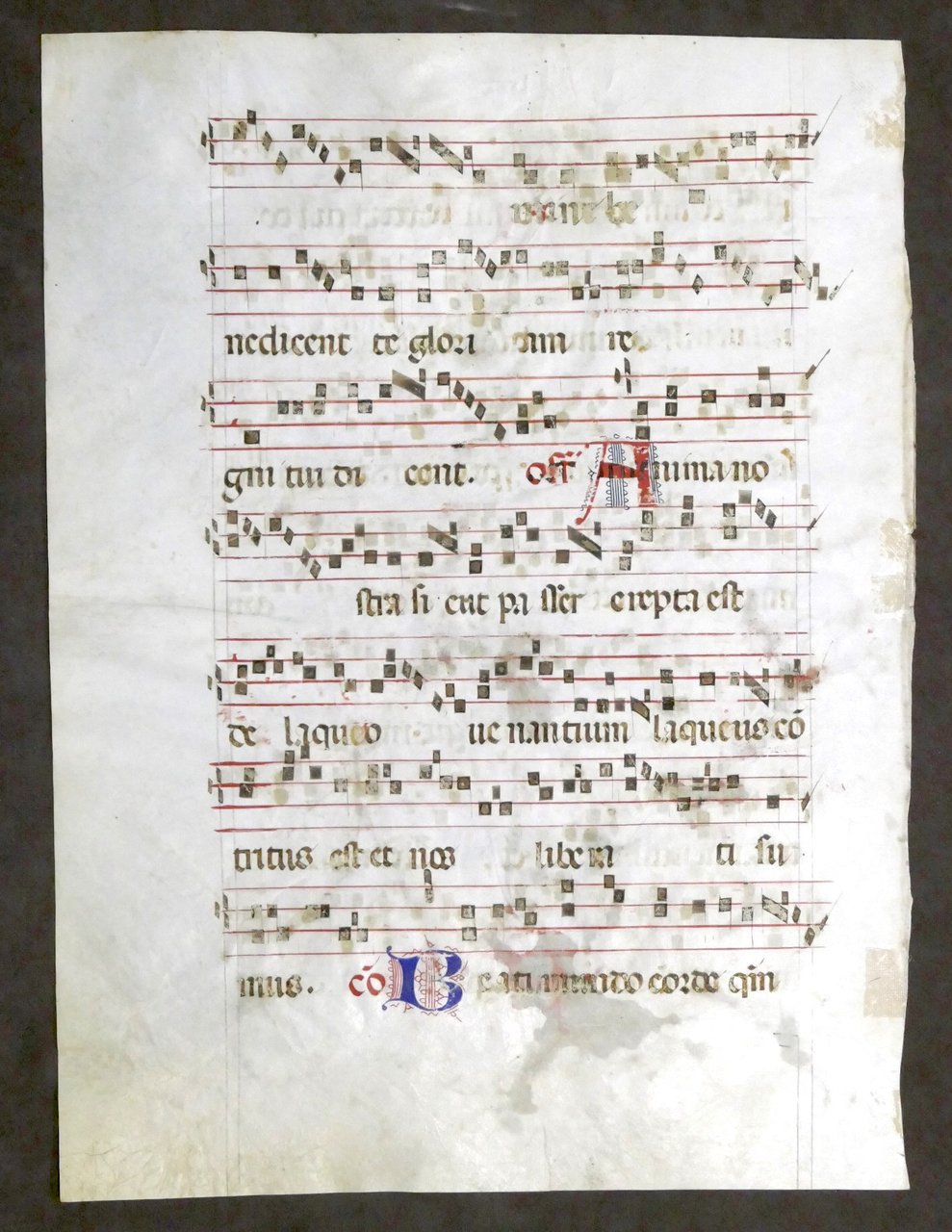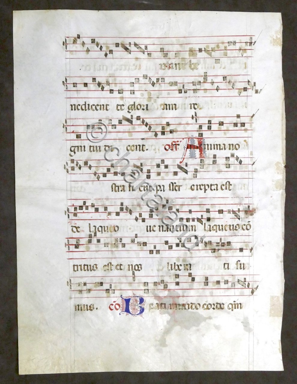 Pagina originale manoscritta da Antifonario medievale - XV secolo Foglio in pergamena; Canto liturgico in latino e note musicali scritte su due facciate, stile gotico. Capilettera in inchiostro rosso e blu. Dimensioni: 24 x 33 cm ca. Provenienza da collezione privata. Condizioni molto buone con piccoli segni del tempo.