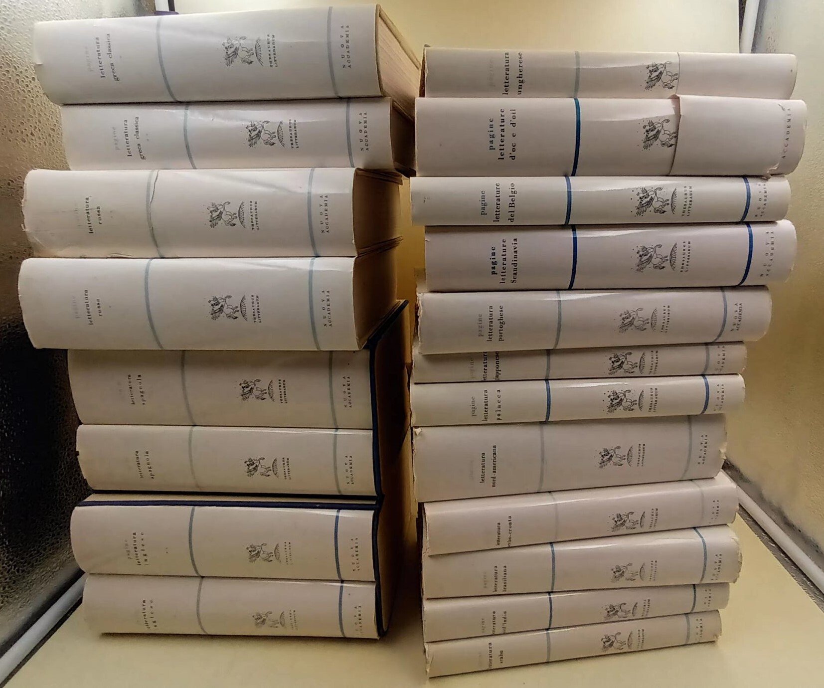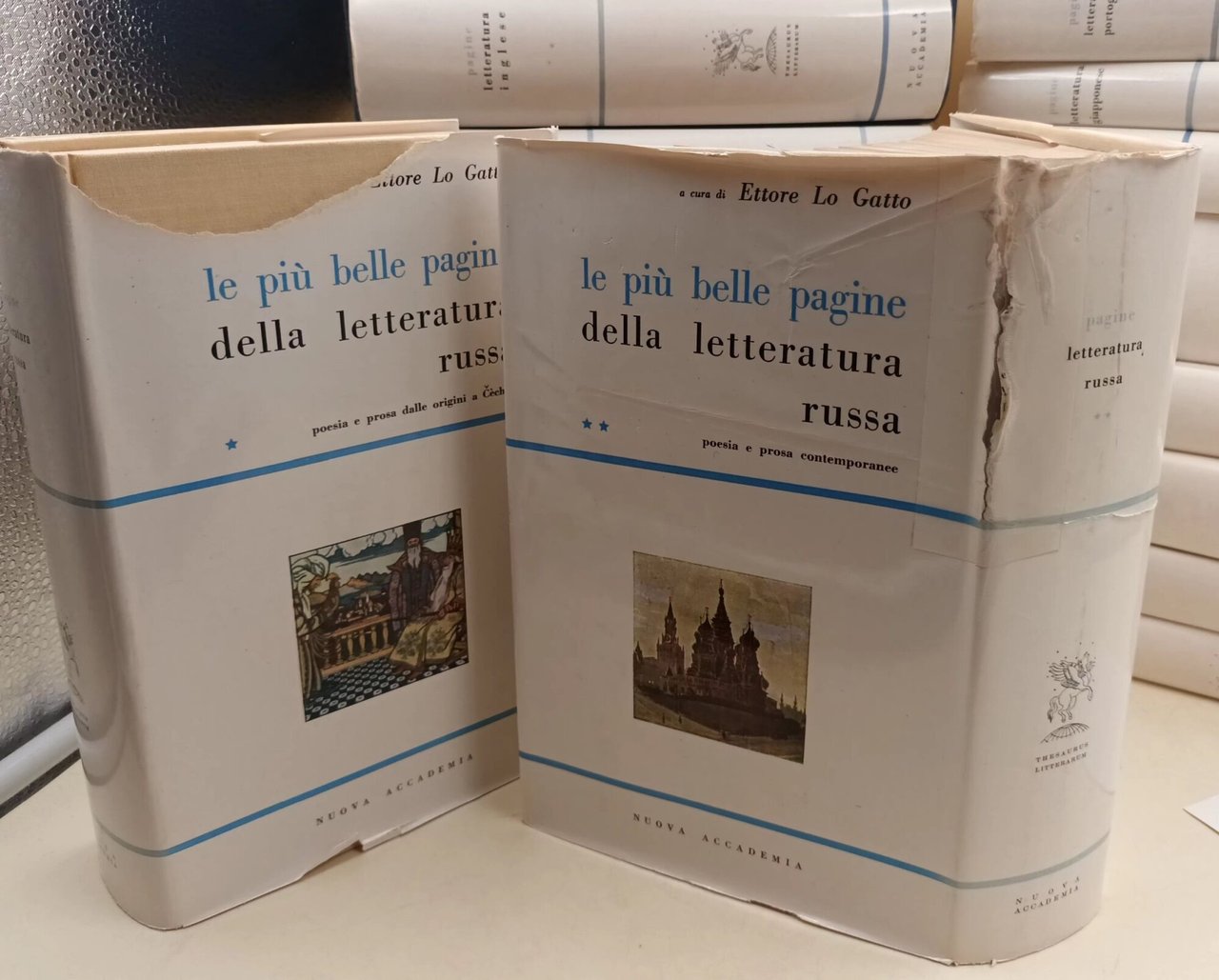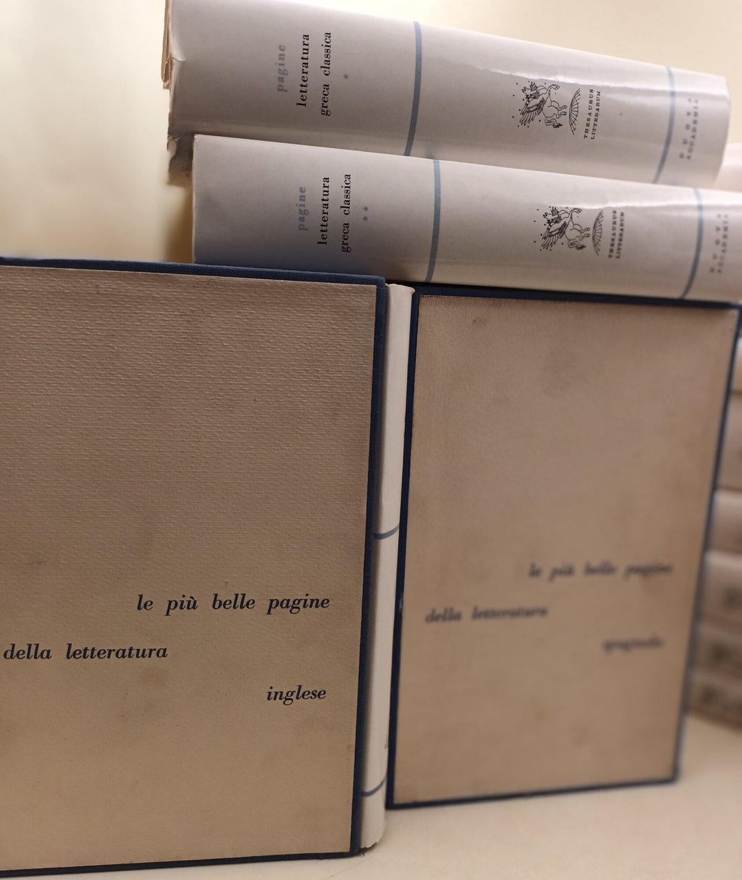 20 tomi in 8', leg. ed. con sovrac., pp. 6000 c.ca, 12 voll. singoli e 4 doppi sulla letteratura russa, greca , spagnola, e inglese; segni d'uso e del tempo, piu evidente ai volumi in foto , fioriture ai margini delle cop., interni in buono stato. Anni 50/60 ***Due to bureaucratic reasons, books dated over 70 years old cannot be immediately exported, please contact us before placing the order.***