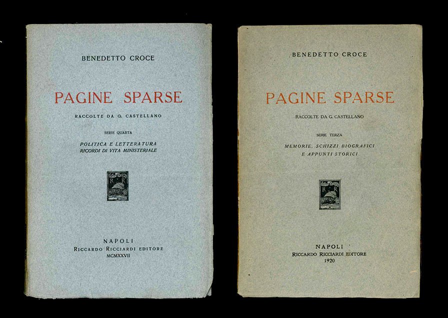 LIBROEdizione originale.Dorsi scoloriti e pagine leggermente brunite, come normale; sporadici difetti (vol. I.2 piccole mancanze a testa e piede del dorso; vol. II mancanza a testa del dorso, lontana dal testo, uno strappo fermato senza mancanze al piatto anteriore e timbro d’appartenenza); nel complesso serie in più che buone condizioni.Serie completa, molto rara, in edizione originale della raccolta di ‘minimalia’ di Benedetto Croce. Così composta: volume primo (= «serie prima») in due tomi 1919, «pagine di letteratura e cultura»; volume secondo (= «serie seconda») 1919, «pagine sulla guerra»; volume terzo (= «serie terza») 1920, «memorie, schizzi biografici e appunti storici»; volume quarto (= «serie quarta») 1927, «politica e letteratura; ricordi di vita ministeriale».Borsari, Opera di Benedetto Croce, nn. 1327, 1405, 1988