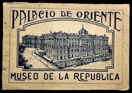 In oblungo (22x15 cm); 18 pp. ognuno con velina protettiva. Brossura editoriale illustrata. Prima ed unica edizione di questo raro souvenir del Palazzo Reale di Madrid, stampato dalla Heliotipia de La Republica.