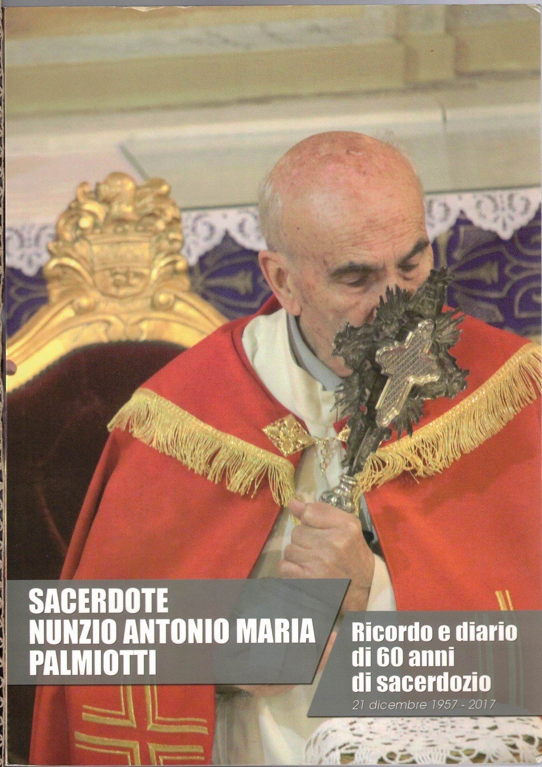 Nunzio Antonio Maria Palmiotti, Sacerdote Nunzio Antonio Maria Palmiotti. Ministro del Signore da 60 anni a servizio della Sposa di Cristo, Molfetta, 21 dicembre 1957-2017 – Parrocchia di san Bernardino. Ricordo e diario, s.d., s.l. (ma stampato a Molfetta, presso la Tipografia La Nuova Mezzina), pp. 101, ill. b.n. e col., cm 24, br. ed. All’interno del volume, conservata immaginetta commemorativa del sessantesimo anniversario di sacerdozio di don Palmiotti. Leggere tracce d’uso alla brossura, per il resto ben conservato.