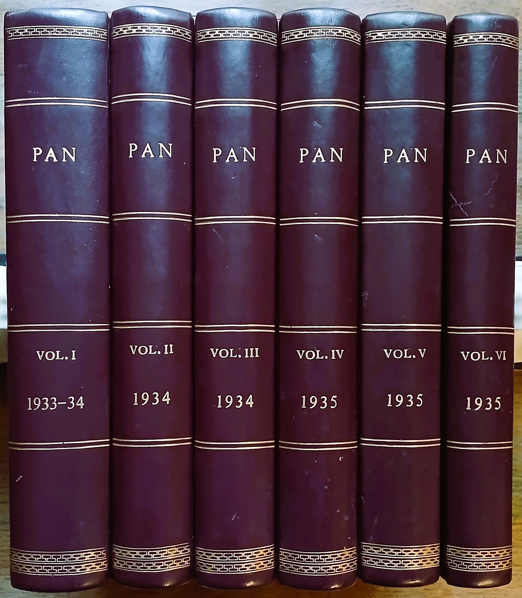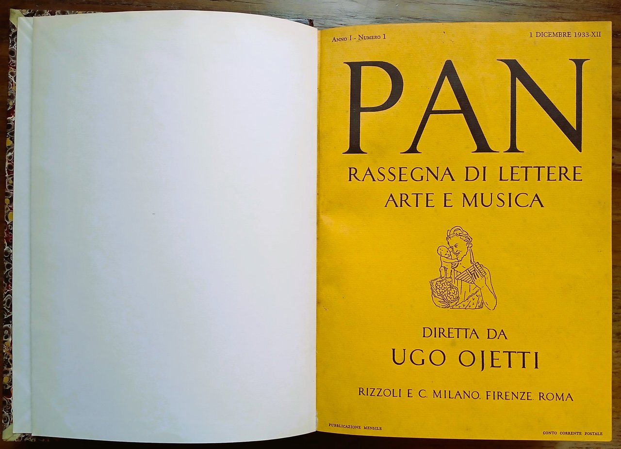 (Riviste culturali - Periodici - Italia) Tutto il pubblicato della rivista mensile "Pan" diretta da Ugo Ojetti, venticinque fascicoli in sei volumi in 8°, legatura in mezza pelle con titoli in oro al dorso, carta marmorizzata ai piatti. Volume primo : dicembre 1933-aprile 1934, pp. 799,(1). Volume secondo : maggio-agosto 1934, pp. 639,(1). Volume terzo : settembre-dicembre 1934, pp. 639. Volume quarto : gennaio -aprile 1935, pp. 639,(1). Volume quinto : maggio-agosto 1935, pp. 639,(1). Volume sesto : settembre-dicembre 1935, pp. 528. In ogni fascicolo illustrazioni in bianco e nero nel testo e pagine pubblicitarie in numeri romani. Sono state conservate le copertine originali solo dei fascicoli 1 (1933) ; 5 (1934) ; 9 (1934) ; 1 (1935) ; 5 (1935) ; 9 (1935) legate all'inizio ed alla fine di ogni volume. Ottimo stato di conservazione dell'intera raccolta.