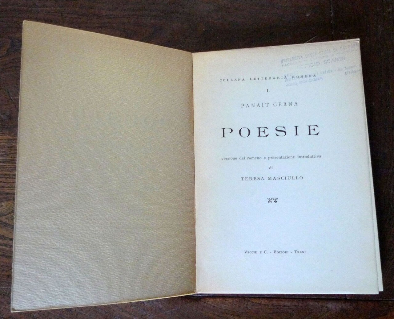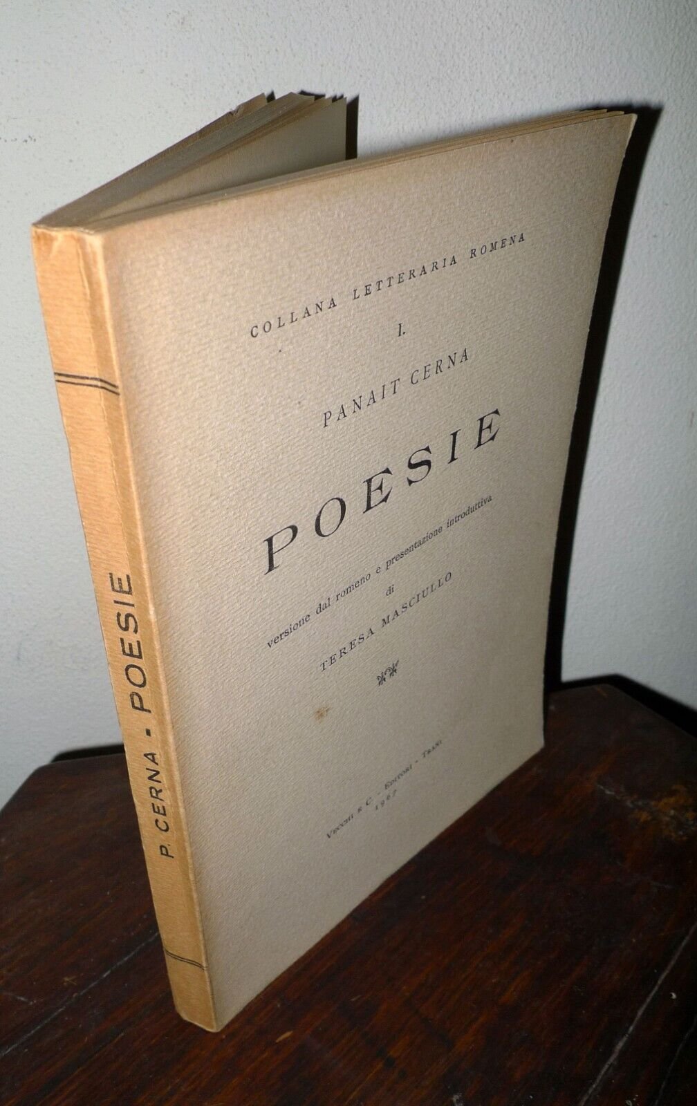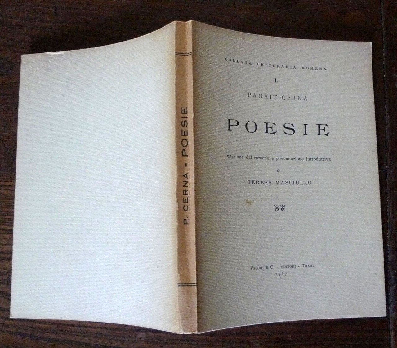 Panait Cerna,POESIE.Versione dal romeno e presentazione introduttivadi Teresa Masciullo.Prefazione di Demetrio Marin.Vecchi e C. Editori, Trani 1967,brossura, 21x15 cm., pp.LXXI-103,COLLANA LETTERARIA ROMENA n.1,peso: g.250