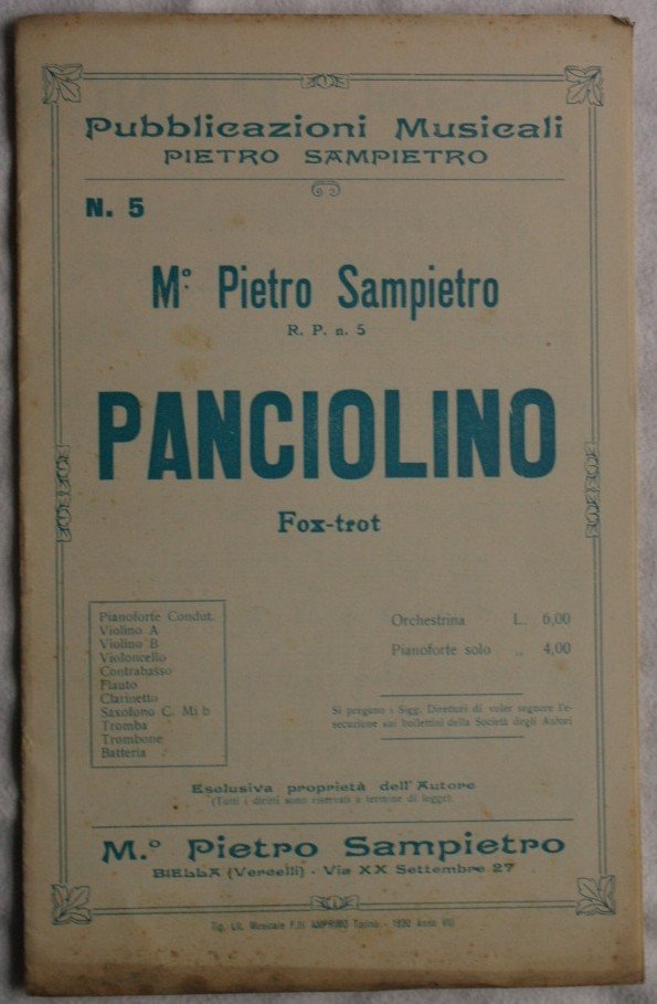 In 8. cm 27,5x17,5. pp 12. partitura completa per orchestra del 1930 di una canzone.<BR>Caratteristica copertina illustrata d'epoca. Ex libris in copertina. In buone condizioni. a complete score for orchestra of 1930. Carachteristic decorated cover of that period. Ex libris in the cover. In good conditions, wearings.