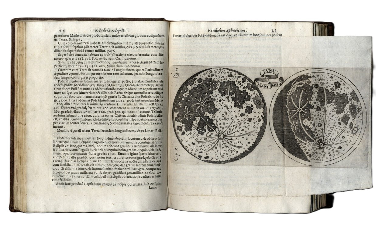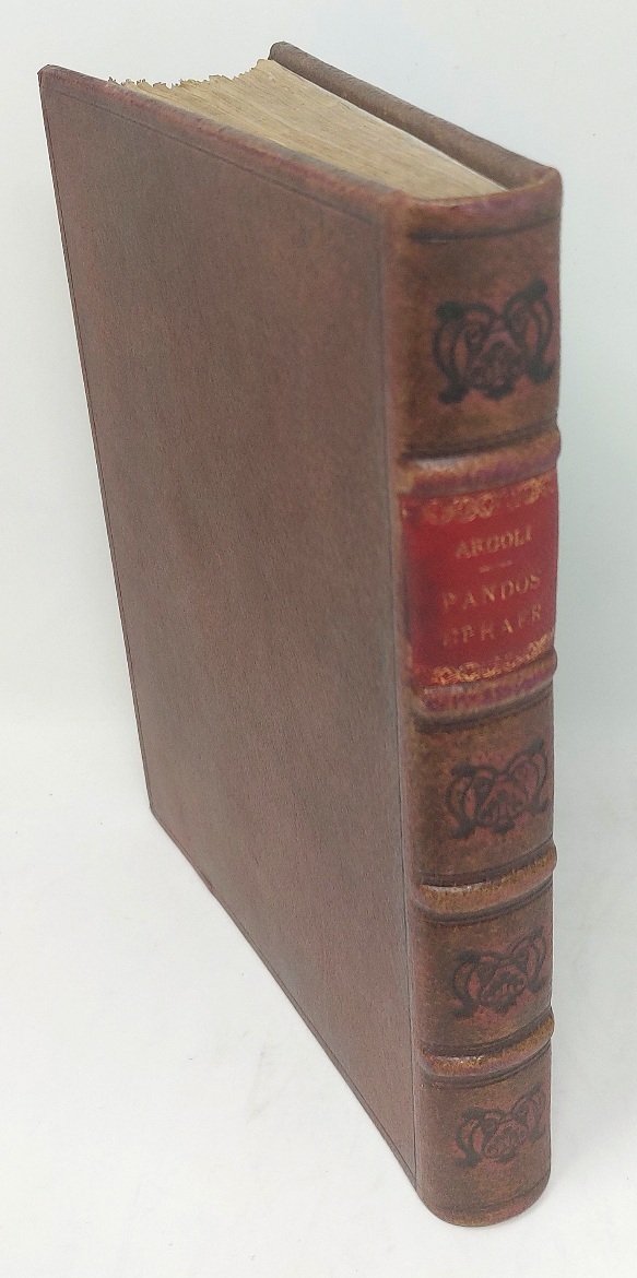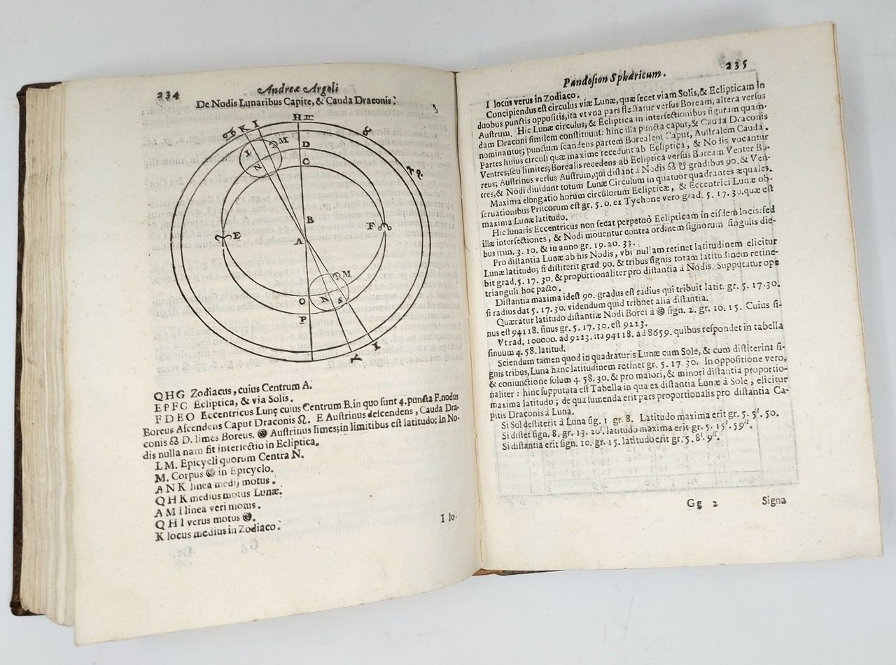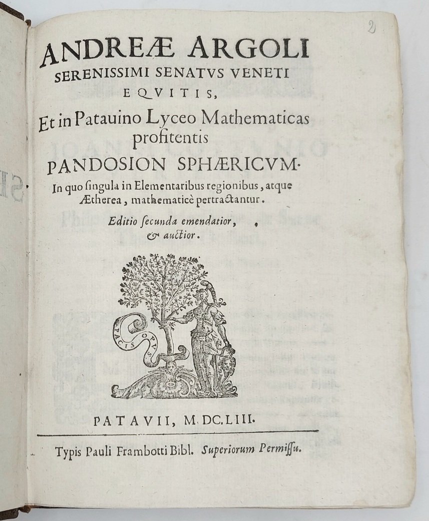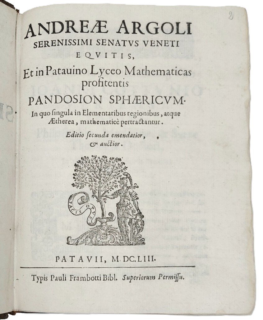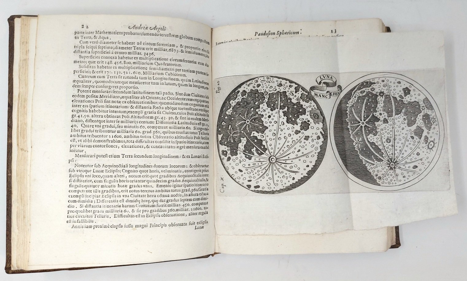 >in-4, pp. (24), 354, leg. moderna p. pelle, tit. oro al dorso. Seconda edizione più ampia della prima (apparsa presso lo stesso stampatore nel 1644) di questo trattato astronomico di grande valore scientifico. «E' un esteso trattato di astronomia, ove però l'a. introduce qualche principio di astrologia» (Riccardi p. 50.9.2). Argoli (1570-1657) fu professore di matematica a Padova. E fu col Riccioli uno dei più fieri oppositori di Copernico in Italia, e il suo sistema è delineato in quest'opera: Mercurio e Venere sono satelliti del Sole, e con gli altri pianeti ruotano intorno alla terra. Il volume è illustrato da una tav. f. t. che riporta una carta lunare, e da figure in legno e rame nel testo che riportano i sistemi di Tolomeo, di Copernico, di Tycho Brahe e quello dell'autore. Buon esemplare. Lalande, p.219. DSB I, 244-245. Thorndike, History, VII, 122 nota 153. Cat. Vinciana II, 1505 (I ediz). Cantamessa I, n.339.