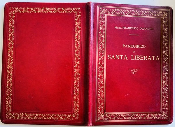 In 4° (23x16,5 cm); 10, (4) pp. Bellissima legatura amatoriale in pieno marocchino rosso con titolo entro ricchissima cornice floreale al piatto anteriore in oro e a secco. Monsignor Comastri Francesco, nipote di Mons. Leonardo, gli succedette nella cura della celebre parrocchia di Santa Isaia. Particolarmente stimato dai fedeli, fu assai sensibile alle tristi condizioni in cui molti si trovarono durante la Prima Guerra Mondiale. Amante delle belle lettere e autore di innumerevoli panegirici e componimenti e parroco dal 1888 al 1918, anno in cui venne a mancare improvvisamente, ancor giovane. Prima edizione in bellissima legatura di questo panegirico dedicato a Santa Liberata da Como (Rocca d'Olgisio, Piacenza Como, 580) monaca benedettina, venerata come santa nella tradizione cristiana occidentale, in particolare a Como, assieme alla sorella Faustina. Liberata nacque agli inizi del VI secolo a Rocca d'Olgisio (Piacenza), da famiglia molto benestante (il padre Giovannato, nobile della val di Taro, possedeva un importante maniero posto sui fianchi della val Tidone ancora oggi esistente). Ella aveva una sorella, pure lei venerata come santa dalla tradizione cattolica, di nome Faustina.<BR>Le due sorelle persero la madre in giovane età e furono affidate ad un tutore di nome Marcello. Il padre non avendo altri figli voleva che le figlie trovassero un degno e nobiliare matrimonio. Ma le figlie erano intenzionate a seguire un altro tipo di vita, quello della contemplazione e della preghiera, al servizio di Dio. Questi desideri vennero contrastati dal padre e le figlie per realizzarlo dovettero fuggire da casa. Esse riparano a Como dove presero il velo dal vescovo Agrippino. Esse adottarono la regola di Benedetto, che proprio in quegli anni iniziò ad espandersi. Fondarono un monastero dedicato a Santa Margherita con annesso oratorio dedicato a San Giovanni Battista, monastero che fu vitale per oltre un millennio e venne poi soppresso nel 1810, per ordine napoleonico, quando vi erano ancora presenti 10 monache. PRIMA EDIZIONE IN OTTIME CONDIZIONI DI CONSERVAZIONE ed in BELLISSIMA LEGATURA.