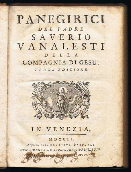 Panegirici del padre Saverio Vanalesti della Compagnia di Gesù. Terza edizione. In Venezia MDCCLI Appresso Giambattista Pasquali Con licenza de superiori e privilegio