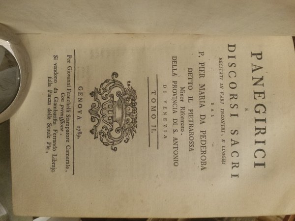 In-8 (16,5 cm) 2 voll. in uno. (4) 287 (1), 376. Fregio xilografato ad entrambi i frontespizi. Piena pergamena coeva. Pier Maria da Pederoba (1703-1785): francescano; fece studi di eloquenza. Morto a Treviso. Timbro E4 sul primo frontespizio.