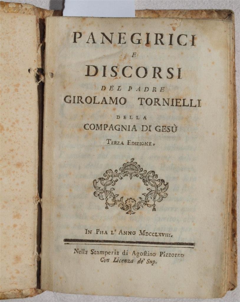 In 16. Dim. 17,5x11,5 cm. Pp. VIII+304. Rara edizione pisana del 1768 di questa raccolta di panegirici e discorsi del Padre Girolamo Tornielli (1693-1752) poeta e religioso italiano. Tra i soggetti dei panegirici: San Petronio detto a Bologna, di San Anselmo a Mantova, San Gianfrancesco Regis detto a Milano, San Tommaso D'Aquino a Alessandria, San Giuseppe, San Ignazio di Loyola, Santa Nunziata, San Francesco Saverio, Santa Caterina da Bologna, San Lorenzo ecc. Copertina cartonata coeva. In buone condizioni. Copertina cartonata in buone condizioni con lievi usure ai margini e dorso. Legatura in discrete condizioni con rotture. All'interno le pagine si presentano in buone condizioni con<BR>fioriture e lievi gore d'umidità marginali. Scarce Pisa edition of 1768 of this collection of odes and speeches by the father Girolamo Tornielli (1693-1752) italian religious man and poet. Among the subjects in the odes: San Petronio told in Bologna, di San Anselmo a Mantova, San Gianfrancesco Regis told in Milan, San Tommaso D'Aquino in Alessandria, San Giuseppe, San Ignazio di Loyola, Santa Nunziata, San Francesco Saverio, Santa Caterina da Bologna, San Lorenzo ecc. Carton coeval cover. In fair conditions. Carton coeval cover in good general conditions slightly worn in the edges and spine. Binding in fair conditions with cracks. Inside pages are in good conditions with foxings and slight humidity stains in the edges.