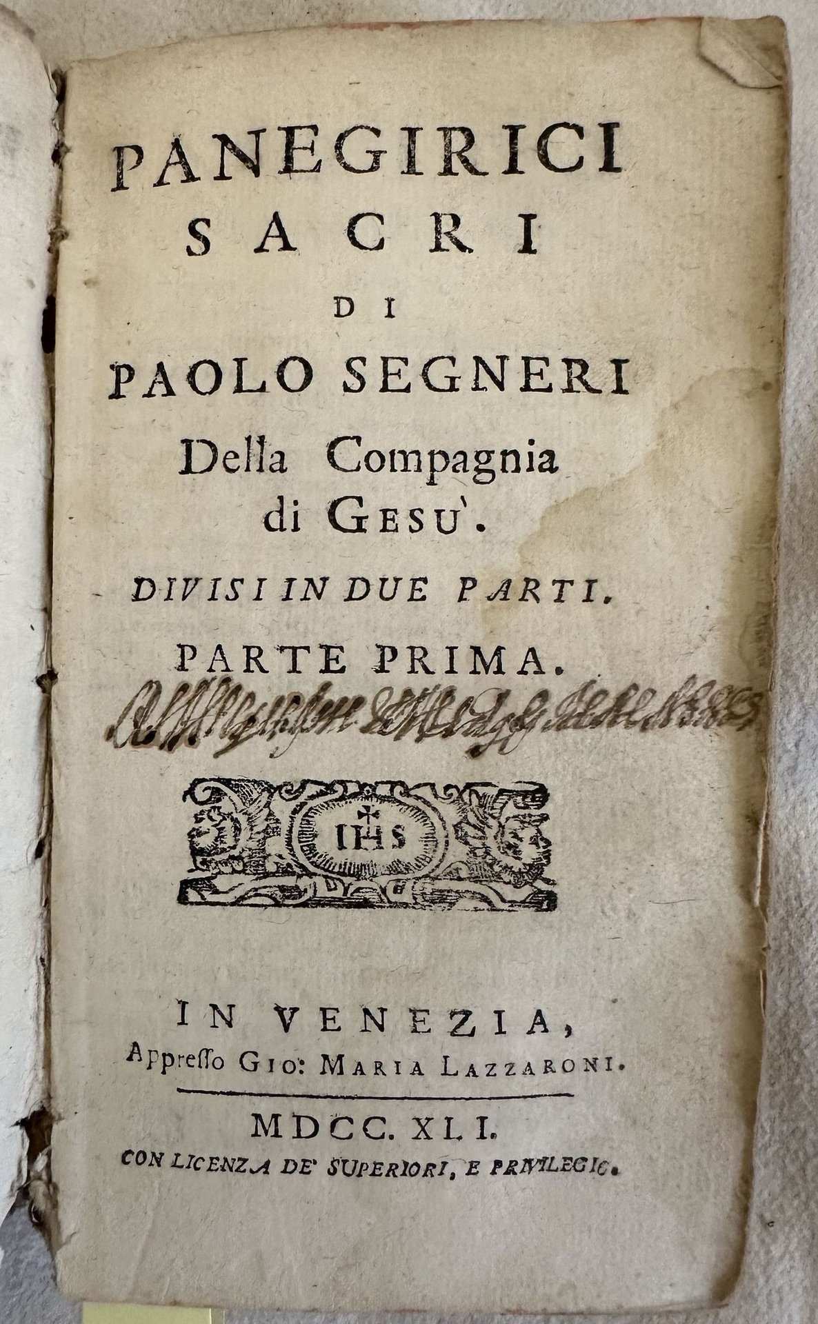 Edizione del 1741 di questa raccolta di panegirici sacri di Paolo Segneri (1624-1694). I panegirici sono stati recitati in diverse città: Perugia, Ancona, Vicenza, Milano, Roma, Modena, Fermo, Bologna, Parma, Torino, Piacenza, Genova, Mantova, Roma, Orvieto, Lucca, Firenze, Siena, Ravenna, Venezia, Pisa ecc. ecc. L'opera è composta da due parti in un unico volume ed è completa. In discrete condizioni. Copertina in piena pergamena coeva con titolo manoscritto al dorso in buone condizioni con lievi usure marginali. Parti mancanti al dorso. Legatura in discrete condizioni con lievi rotture. Corpo del libro in parte staccato dalla copertina. Pagine in buone condizioni con fioriture. Lieve gora d'umidità. In 16. cm 16x9. Pp. 550+(2).Edition of 1741 of this collection of holy sermons by Paolo Segneri (1624-1694). The sermons have been recitated in different citiues: Perugia, Ancona, Vicenza, Milano, Roma, Modena, Fermo, Bologna, Parma, Torino, Piacenza, Genova, Mantova, Roma, Orvieto, Lucca, Firenze, Siena, Ravenna, Venezia, Pisa ecc. ecc. The work is made up of two parts in a unique volume and it is complete. In fair conditions. Full parchment coeval cover with handwritten title in the spine in good general conditions lightly worn in the extremities. Lackings in the spine. Binding in fair conditions with light cracks. The body of the book is partially detached from the cover. Inside pages are in good conditions with foxing. Light dump stain in the edges. In 16. cm 16x9. Pp. 550+(2).<BR>