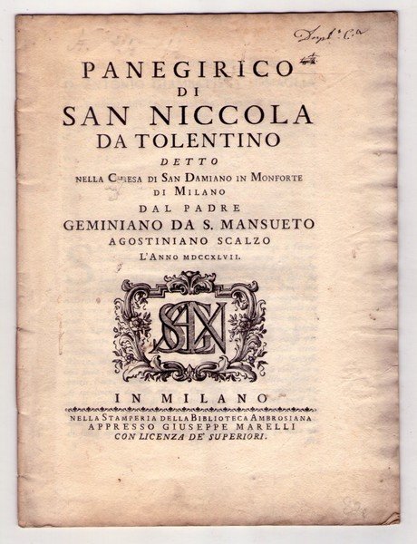 Panegirico di San Niccola da Tolentino. Detto nella Chiesa di San Damiano in Monforte di Milano dal Padre Geminiano da S. Mansueto Agostiniano Scalzo.