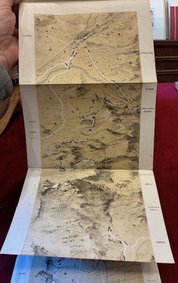 8vo (cm. 22,5), 19 cc.nn - ripiegate ed illustrate solo al recto in fototipia (c.d. leporello per un totale di cm. 280) - a formare il panorama dell’intera tratta ferroviaria completo dell’orografia e dell’indicazione di tutti i centri abitati. Sulla prima carta un’immagine della città di Roma e sull’ultima un panorama di Sulmona. Legatura editoriale in tela rossa con cornici dorate ai piatti (al centro di quello anteriore il titolo impresso in oro). Tela e dorature leggermente sbiaditi, peraltro esemplare in ottimo stato di conservazione. Provenienza: Collezione Spina, Avezzano (timbretto ex libris al piatto anteriore).