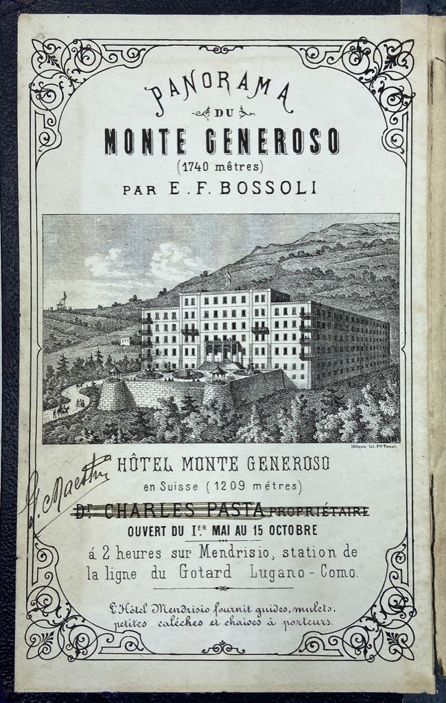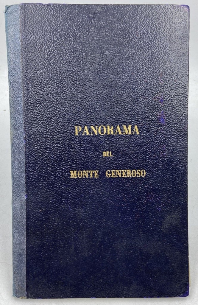 Bossoli, Edoardo Francesco (1830 - 1912) PANORAMA PRESO DAL MONTE GENEROSO - PANORAMA DU MONTE GENEROSO (1740 mêtres) par E. F: BOSSOLI. Milano, F.lli Tensi Lit. Editori. [1875] Ampio panorama in litografia, più volte ripiegato e composto di 4 fogli congiunti, custodito entro copertina in mezza tela con titoli dorati sui piatti in percallina. Ben conservato, minima imperfezione editoriale in una delle giunture tra i fogli. Celebre e suggestivo panorama disegnato da Edoardo Francesco Bossoli, allievo e collaboratore del celebre zio Carlo, dalla vetta del Monte Generoso; la veduta fu all'origine pubblicata come allegato del ventiquattresimo Bollettino del CAI (1875), e poi proposta in edizione autonoma per iniziativa dell'albergatore Carlo Pasta, titolare dell'Hotel Monte Generoso - al verso del piatto anteriore del fascicolo presente una veduta dell'albergo, con indicazione del proprietario corretta a mano in questo esemplare. Così l'autore descriveva, sulle pagine del Bollettino, il proprio lavoro: «il panorama che ho tracciato con tutta fedeltà e colla esatta nomenclatura delle montagne che vi sono visibili, offre già da sé l'idea della straordinaria estensione e varietà di tale veduta, che dalle nevose cime delle Alpi Retiche e Lepontine a levante e tramontana, va verso ponente alla gran cerchia delle Alpi Pennine, Graie, Cozie e Marittime, ed a mezzodì dalle estese pianure lombarde alla cerulea catena dell'Appennino. In quest'ampia cornice spiccano il lago di Lugano ed i laghetti del contado varesino, mentre per qualche tratto si mostrano anche il Verbano ed il Lario. Ciò che rapisce poi è la maestosa figura del monte Rosa che illuminato dai raggi del sole nascente, giustifica talmente il proprio nome da sembrar quasi una fantastica creazione».