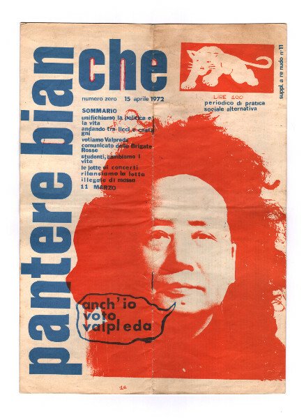 Brossura (cm 34x12) pag 16 a colori stampate e illustrate con grafica underground. - Rivista che prende il nome dalle White Panthers statunitensi del poeta John Sinclair e pubblicata a Milano come supplemento a Re Nudo. Al numero zero seguì solo il numero uno.-- Sommario: Unifichiamo l politica e la vita - Andando tra Licci e Castagni - Votiamo Valpreda - Comunicato delle Brigate Rosse - Studenti cambiamo la vita - Le lotte ai concerti - Rilanciamo la lotta illegale di massa - 11 marzo.