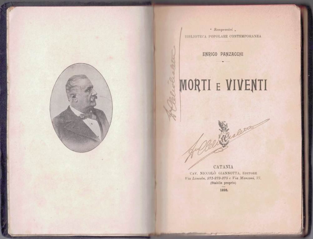 Enrico Panzacchi, Morti e viventi, Cav. Niccolò Giannotta Editore, Catania 1898, pp. VI, 190, XVI, in antiporta 1 c. di tav. f.t. ill. b.n. con ritratto dell’autore, finalini e testatine ill. b.n., cm 17, legatura in tutta tela ed. con titoli in oro al dorso e taglio superiore spruzzato in rosso. Collana Semprevivi. Biblioteca popolare contemporanea. Indice: Morti e viventi – Gabriele d’Annunzio – Ernesto Renan in Italia – I giovani – Pittori scozzesi – Simbolisti – Un ritorno a Goldoni – Monaca e romanziere – Paolo Ferrari – Mastro-Don Gesualdo – Il romanzo di un maestro – La letteratura del carcere. Al verso della prima carta, timbro di libraio (Libreria Editrice N. Giannotta – Catania) e piccola etichetta in carta con numero progressivo di classificazione. Due firme d’appartenenza al frontespizio. Lievi tracce d’uso, minima brunitura della carta, per il resto ottimo.