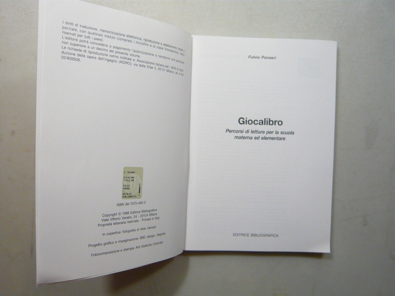 Fulvio Panzeri GIOCALIBROPercorsi di lettura per la scuola materna e elementareEditrice Bibliografica, Milano, 1998Brossura, 24x17 cm, pp. 5-199Con immagini in bianco e neroPeso: g. 489
